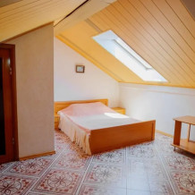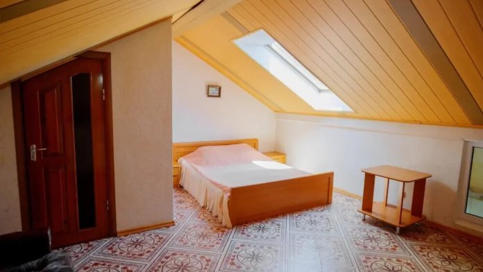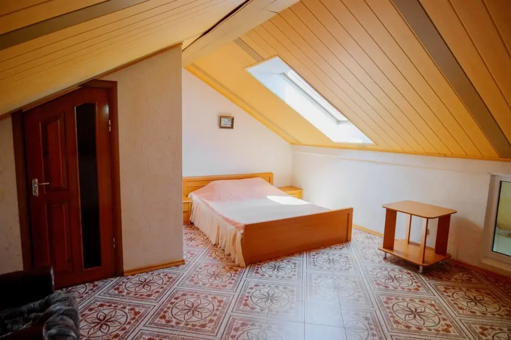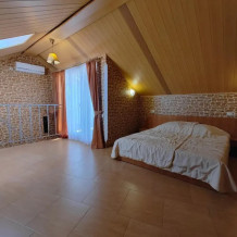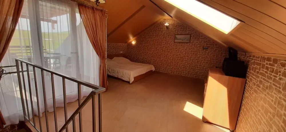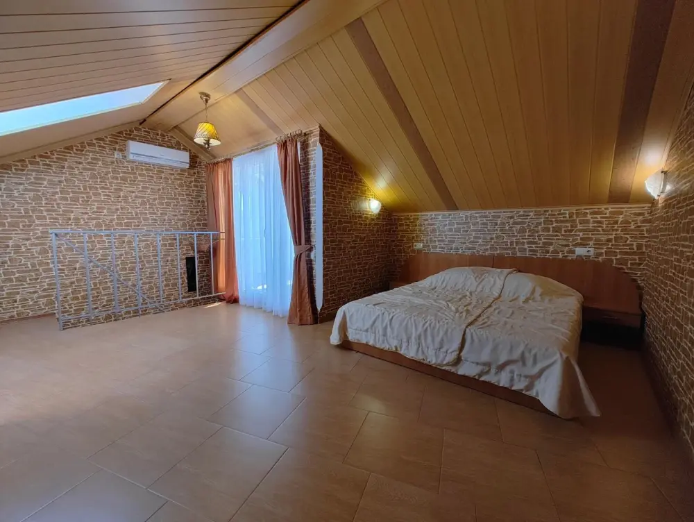 Номер со спальней на втором уровне и мансардным окном.