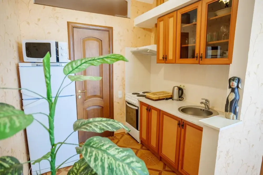 Двухкомнатный номер со спальней и кухней, оборудованной всем необходимым для самостоятельной готовки.