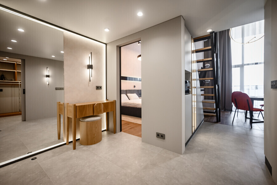 Этот стильный и современный двухуровневый апартамент идеально подходит для тех, кто ищет комфорт и роскошь в одном флаконе. Просторная гостиная, оформленная в современном стиле, с высокими потолками и выходом на балкон. Полностью оборудованная кухня с качественной техникой и современными удобствами, идеальная для кулинарных экспериментов и семейных сборов. На верхнем уровне расположены 2 уютные спальни и рабочая зона. Оснащение номера и мебель: рабочее пространство, шкаф, сушильная машина, утюг.