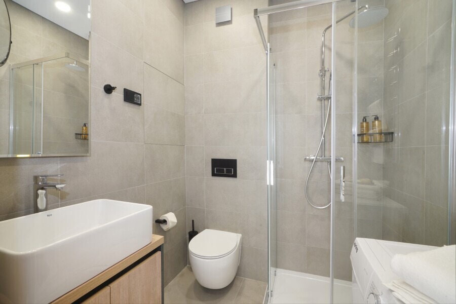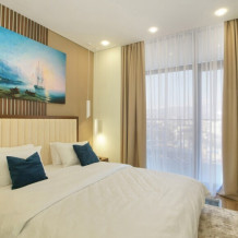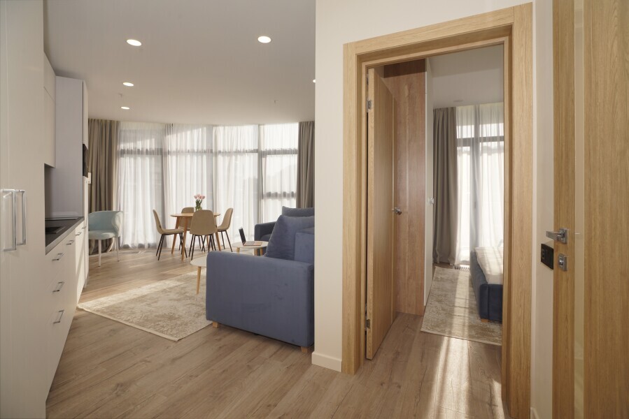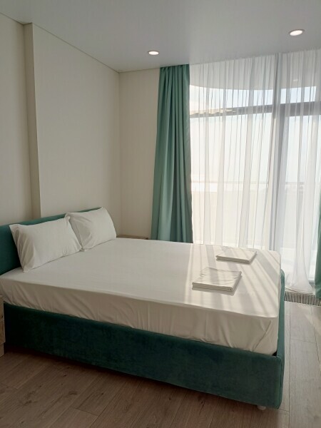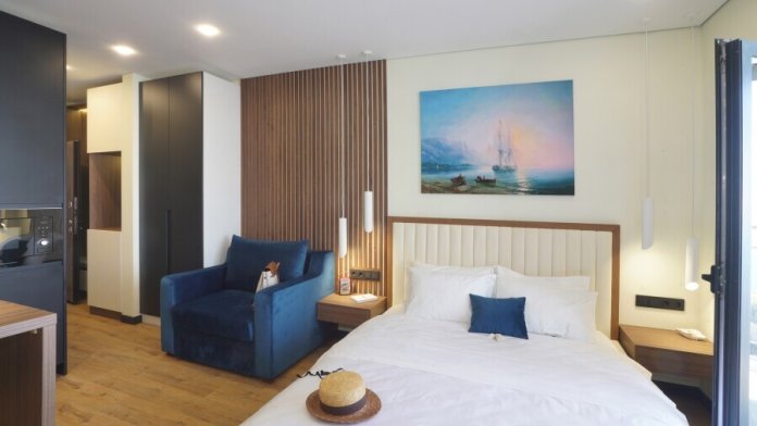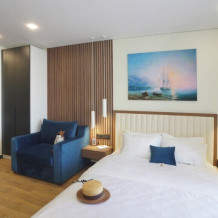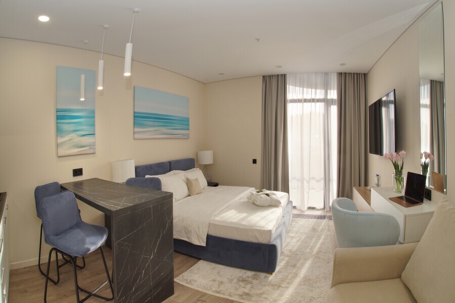 Комфортные двухкомнатные апартаменты в элегантном дизайне, каждый с балконом и видом на море. Отдельная спальня с двуспальной кроватью и пространство гостиной с диваном (раскладывается) и кухонной, обеденной зоной. Оснащение номера и мебель: рабочее пространство, шкаф, сушильная машина, утюг.