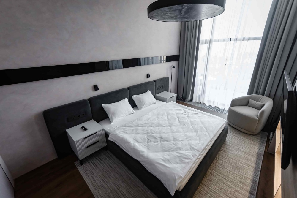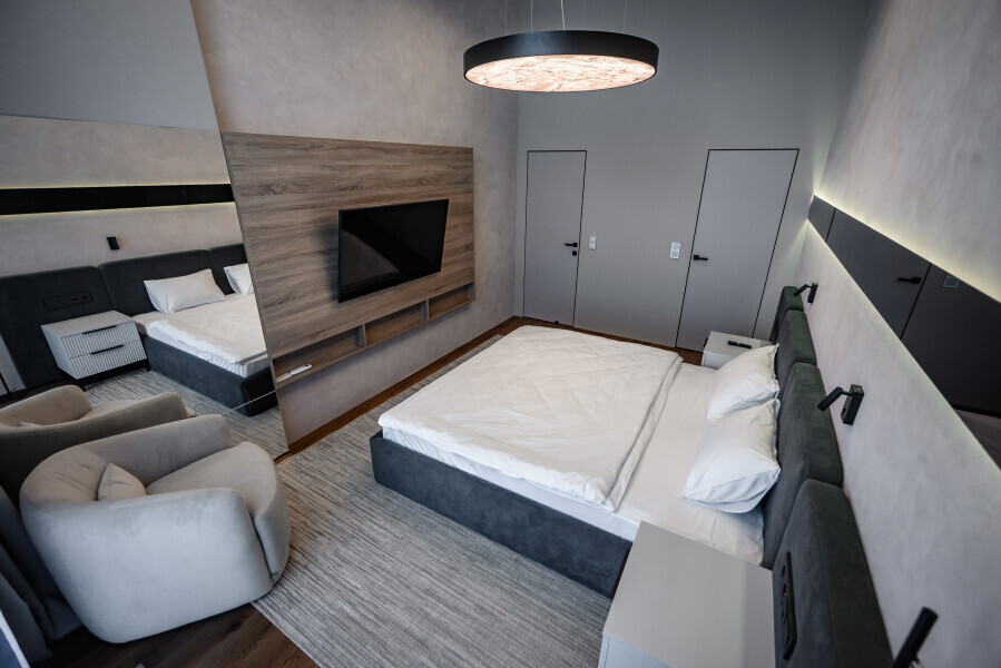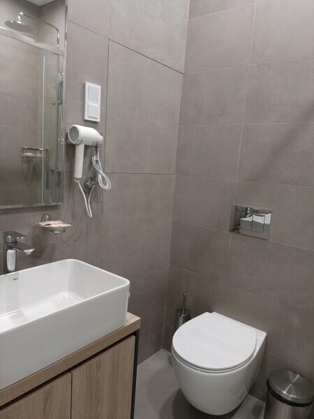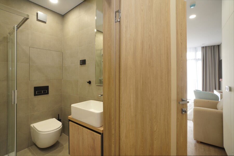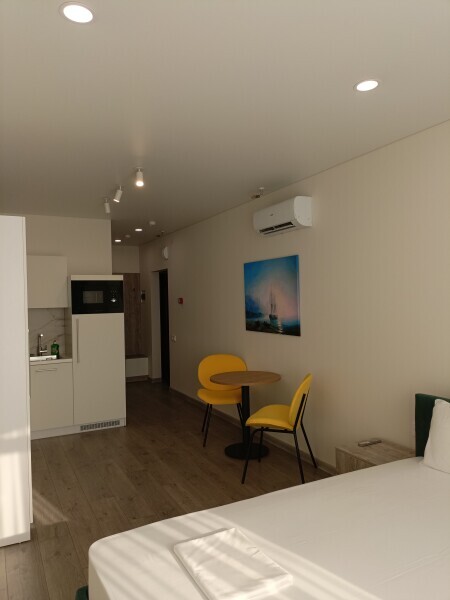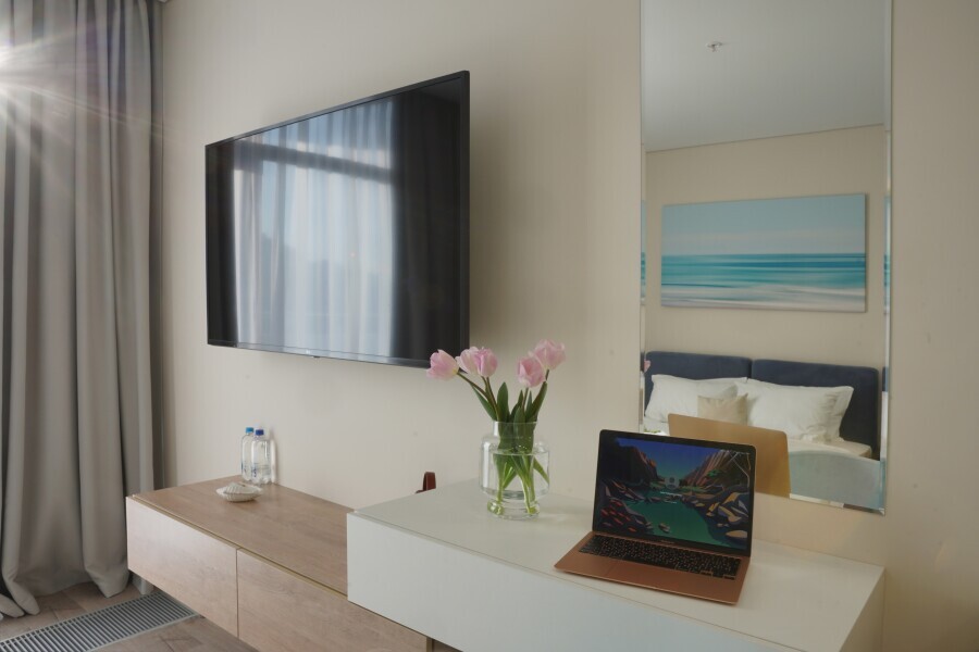 Все апартаменты имеют телевизоры со Smart TV и выход на собственную террасу, где каждый гость может проводить уютные вечера с близкими. Гостям предоставляются халаты по запросу, тапочки можно приобрести на ресепшне.