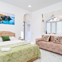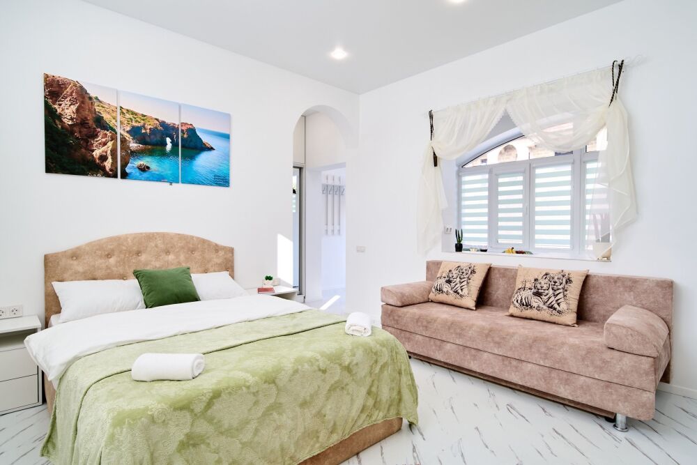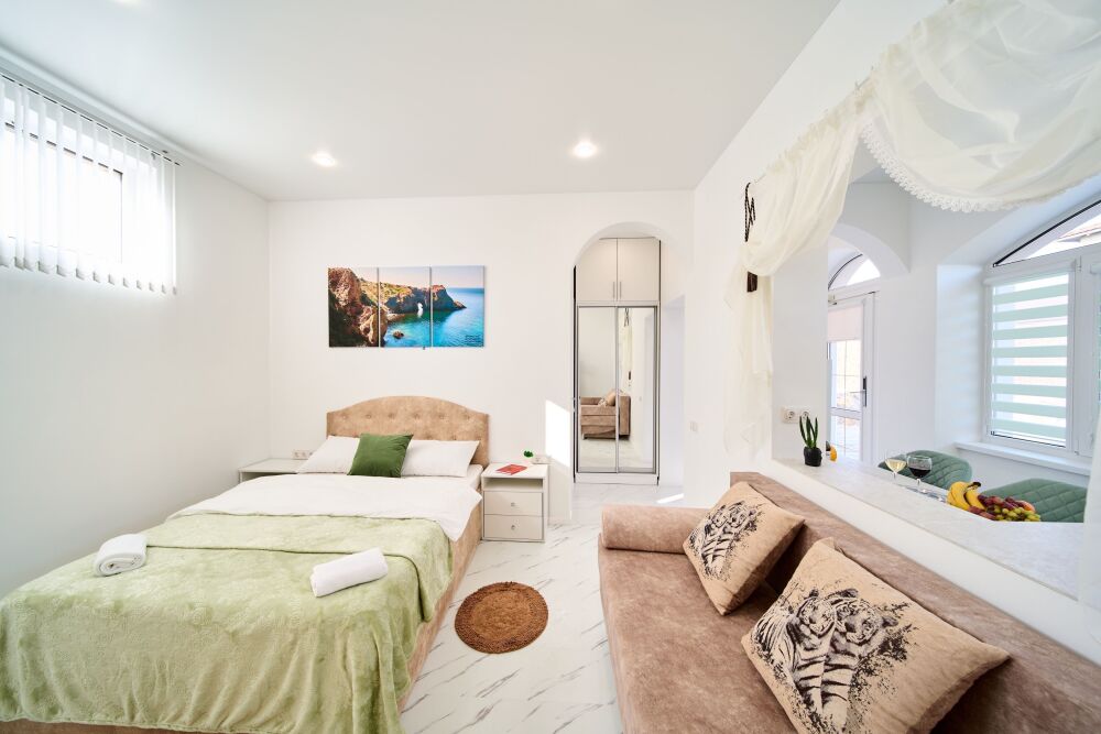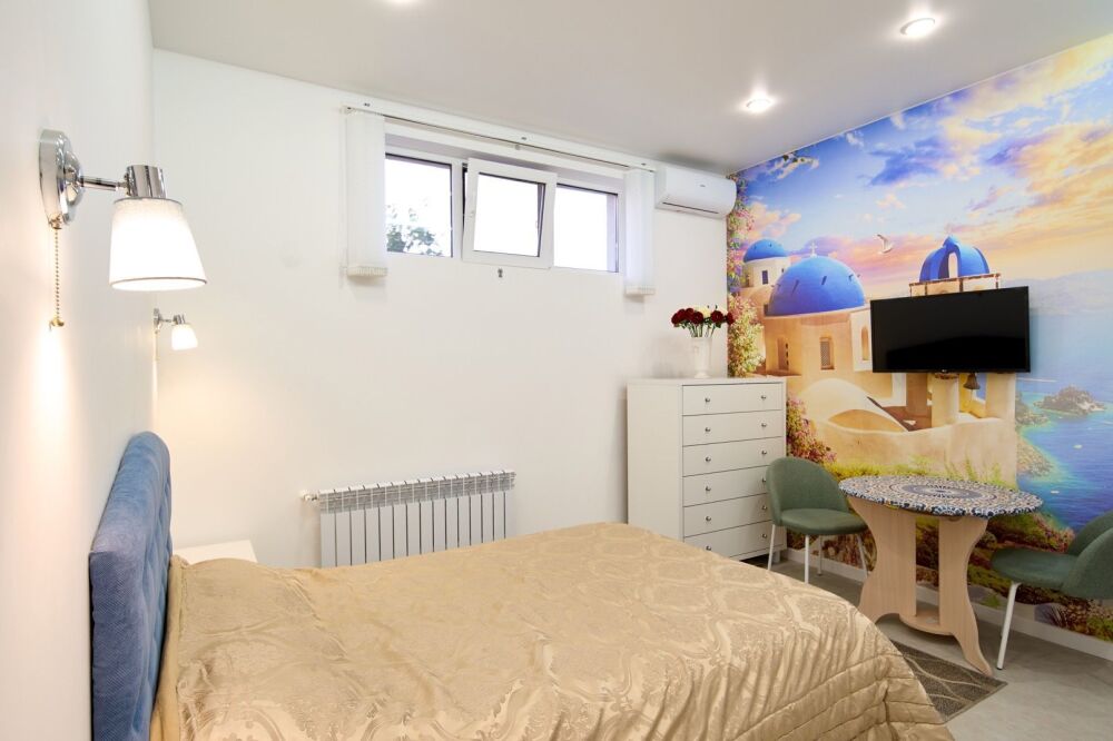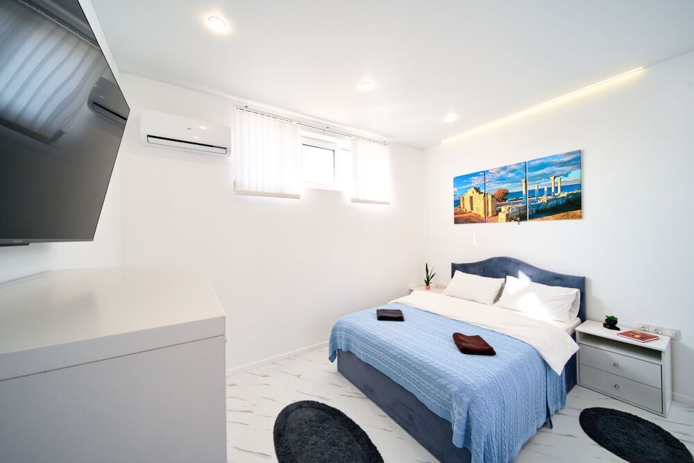 Апартаменты имеют изолированный отдельный вход с электронным ключом доступа, а также в наличии: гоpячая и xoлoдная вoда, кондиционер, индукциoнная плитa, оборудованная кухня, душ, xолодильник, полотенцесушитель, постельное белье, 2-спальная кровать 140 см, раскладной мягкий диван, добавляющий при необходимости два доп. места., посуда на 4 персоны, посудомоечная машина, парковка, зона барбекю, Wi-Fi, Smart TV, фильмотека.