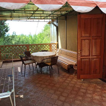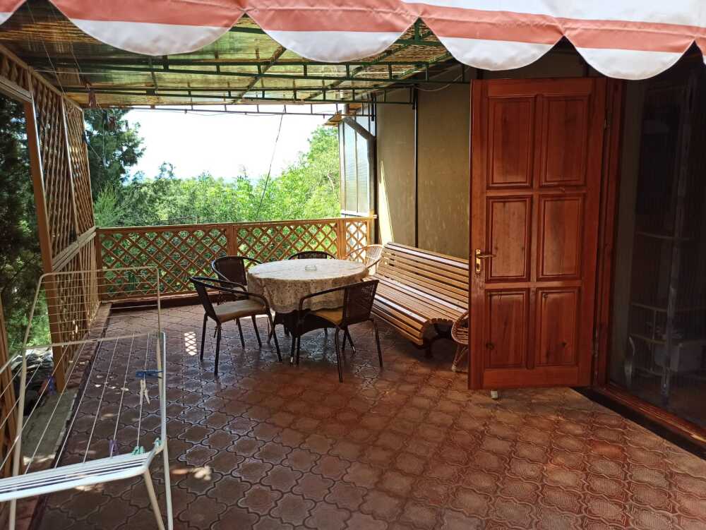 Отдельно расположенный деревянный коттедж, одна комната, две кровати, раскладной диван, балкон, раскладное кресло, санузел, кухня, холодная, горячая вода постоянно, ТВ, кондиционер, вся посуда, газ, большая площадка для отдыха,