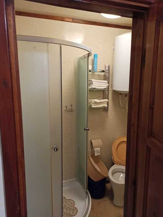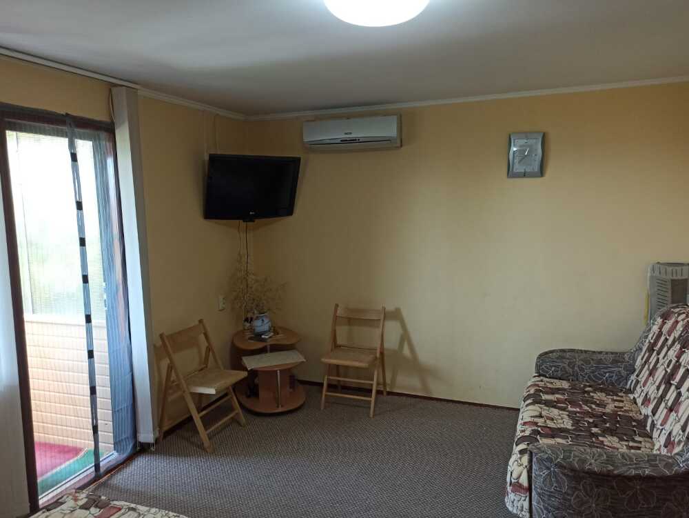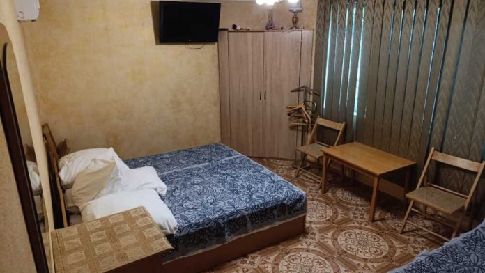 2-й этаж 2-этажного летнего дома, одна комната на семью 2 взрослых и 1,2,3 ребенка. Две односпальные кровати, топпер, раскладной диван, раскладное кресло, кондиционер, ТВ, утюг, белье, кухня, посуда, газ, холодильник, микроволновая печь, горячая и холодная вода постоянно, большой балкон с мебелью для отдыха.