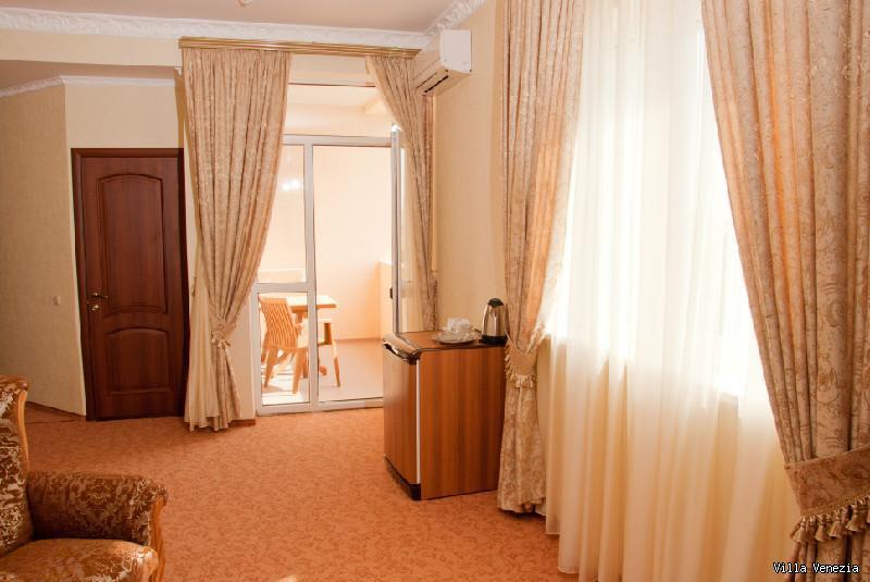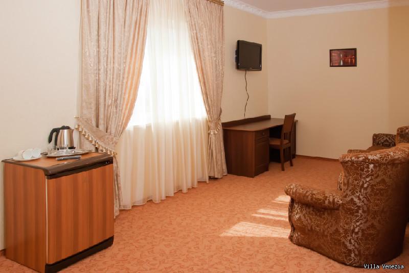 В номере есть ковровое покрытие, кровать (двуспальная 1800*2000, или 2 полуторные 900*2000), чайный набор, рабочий стол, стулья, внутренний телефон, платяной шкаф, журнальный столик, кресла, балкон со столом и стульчиками, сушилка.