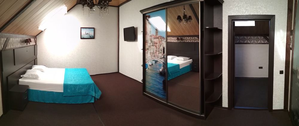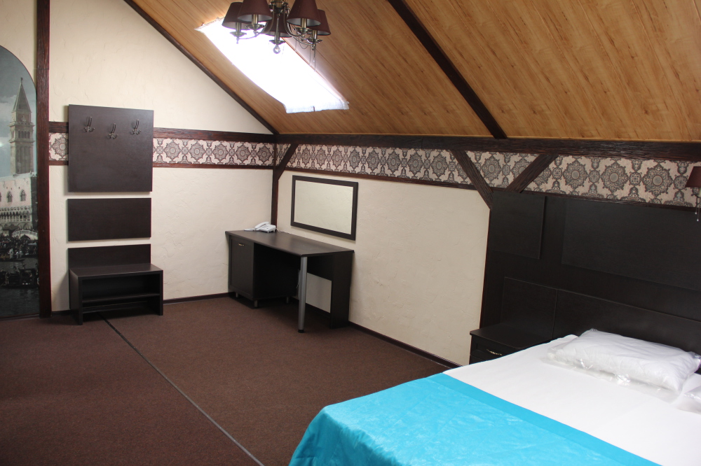 Просторный двухместный номер (20 м.кв.), расположен на мансардном этаже отеля. Номер оснащен двумя односпальными кроватями ( или одной двуспальной) с ортопедическими матрасами, телевизором, холодильником, кондиционером, чайником и ковровым покрытием. Общие душевая и туалетная комнаты на этаже на 2 номера.