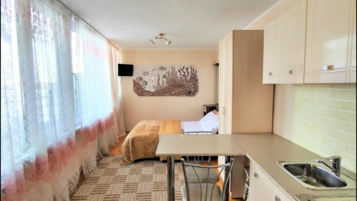 Студия очень светлая с большими окнами на сторону моря. Присутствует частично вид на море. Имеются все необходимые условия для комфортного проживания и отдыха: удобное спальное двуспальное место, шкаф, стулья, кондиционер, телевизор, вай-фай, горячая и холодная вода постоянно, кухонная плита, посуда, электрочайник, холодильник, постельные принадлежности и полотенца, утюг. Кухонная зона оснащена электроплитой, посудой, электрочайником, холодильником. Собственный санузел в номере (душ и туалет). Горячая и холодная вода круглосуточно.