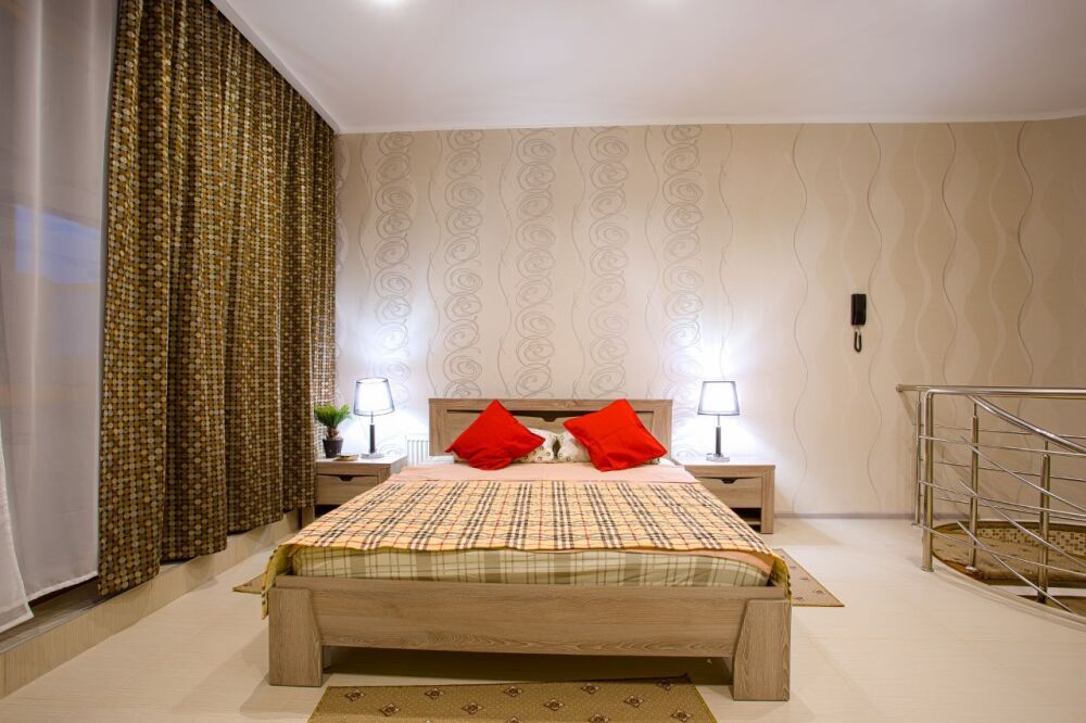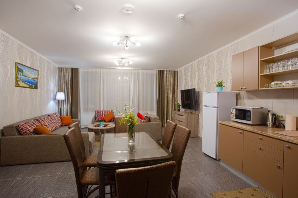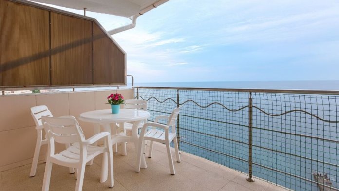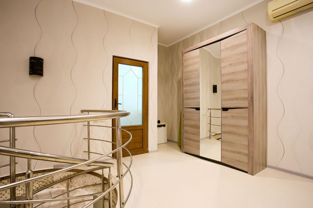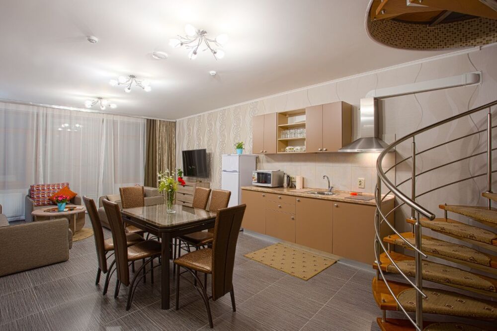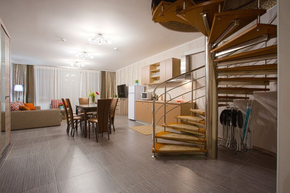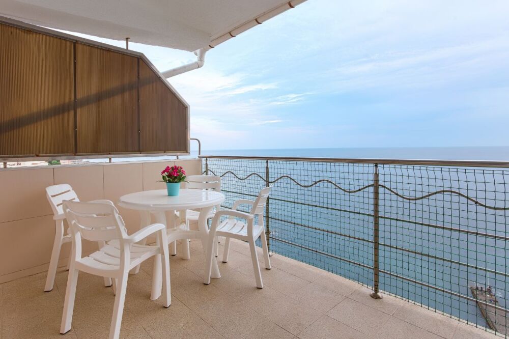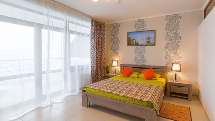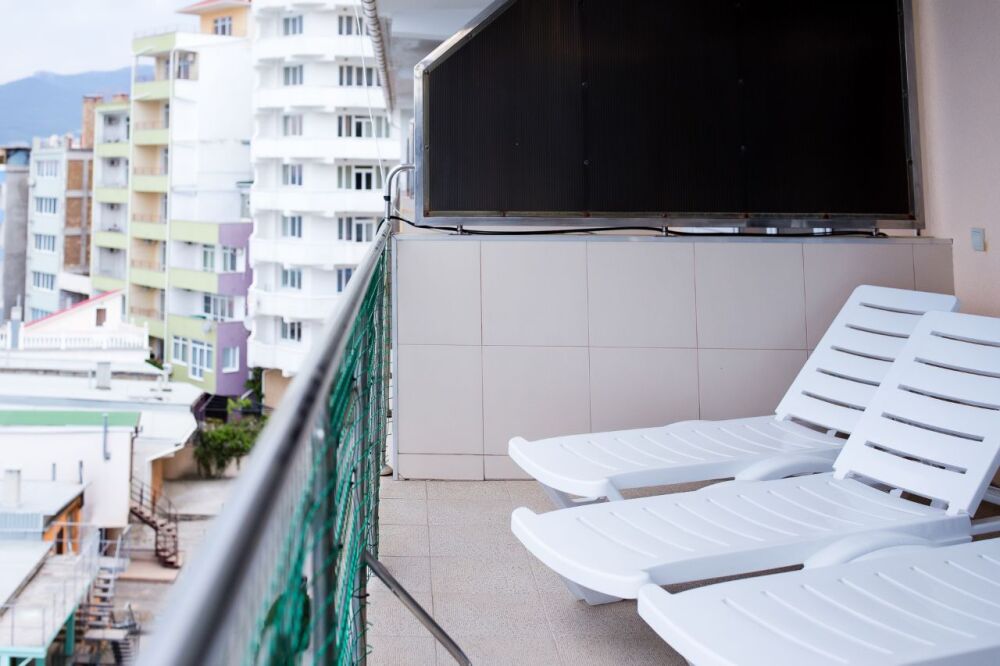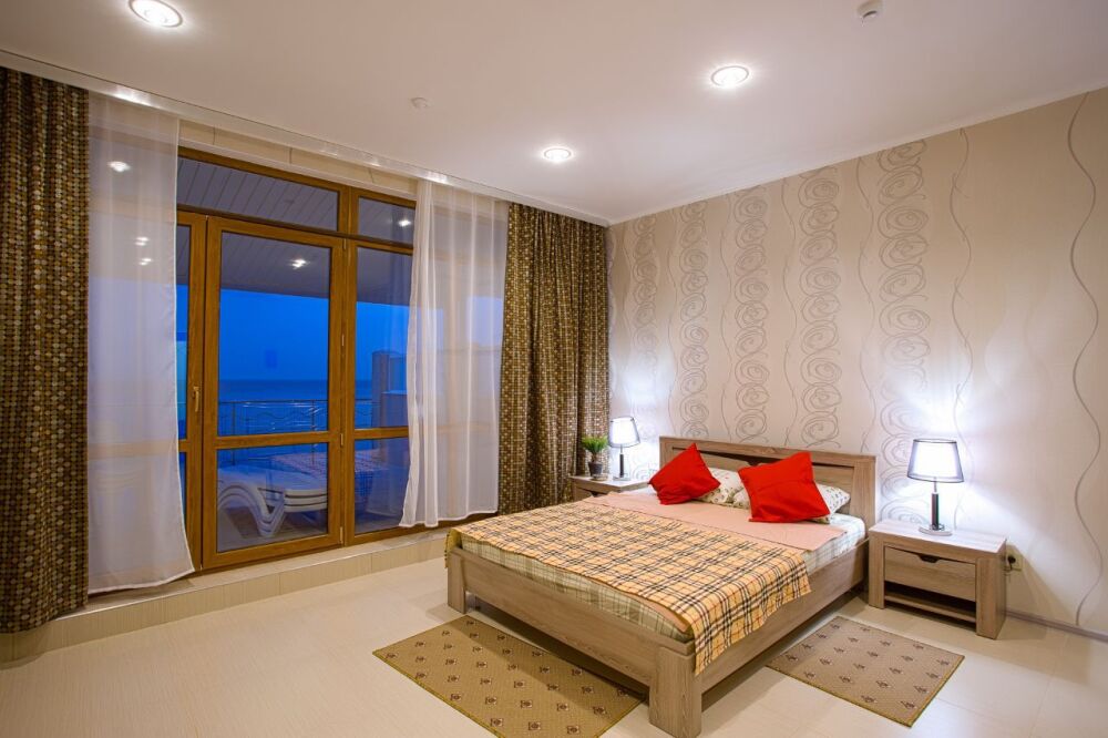 Апартаменты занимают два последних этажа (6 и 7 этажи) Wi-Fi, 2 балкона с видом на море и удобными шезлонгами, 2 телевизора 55 дюймов, кондиционер, холодильник, микроволновая печь, чайник, электроплита, посуда, стиральная машина, утюг и гладильная доска, фен. На первом этаже: оснащенная всей необходимой техникой кухня-гостиная (спальные места: большой двуспальный раскладной диван, 2 односпальных раскладных кресла) и санузел, балкон. На втором этаже: спальня с двуспальной кроватью, санузел, терраса.