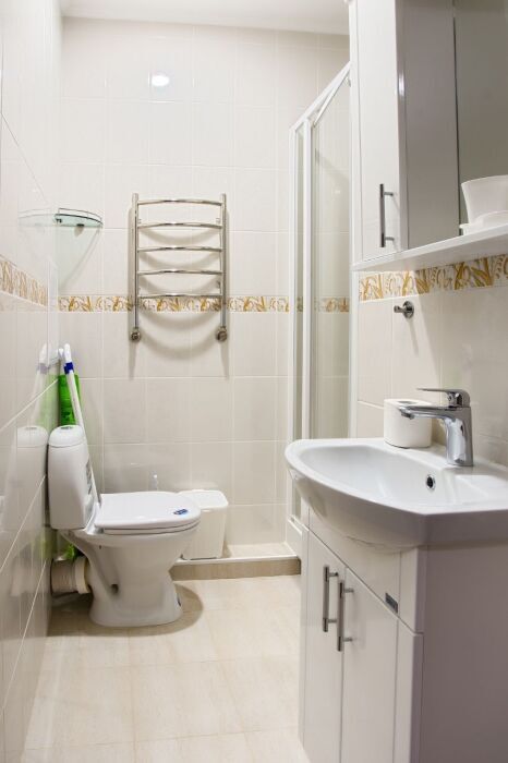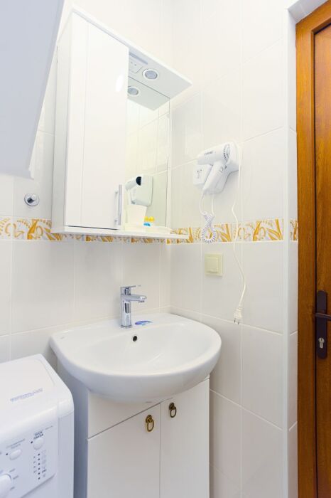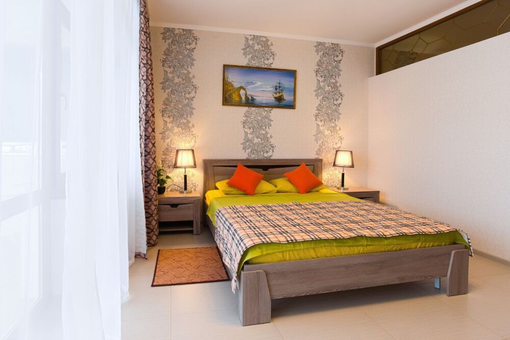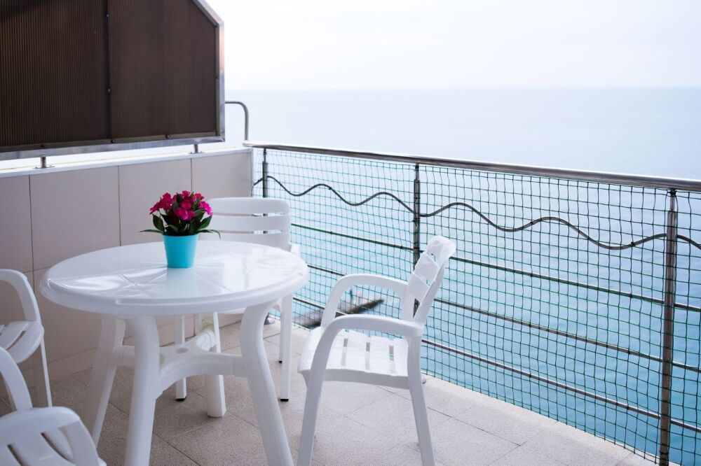 Апартаменты с видом на море находятся на 3-м этаже. Wi-Fi, балкон с видом на море и шезлонгами, телевизор, кондиционер, холодильник, микроволновая печь, чайник, электроплита, посуда, стиральная машина, утюг и гладильная доска, фен. Предоставляем полотенца, постельное белье и средства гигиены. Комната 1: кухня-гостиная (спальные места: раскладной 2-местный диван, односпальная кровать). Комната 2: спальня с двуспальной кроватью. Для детей предоставляем детскую кроватку, стул для кормления и горшок.