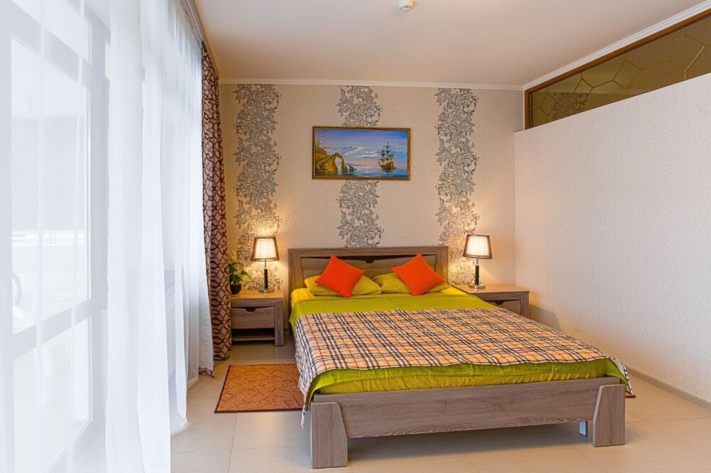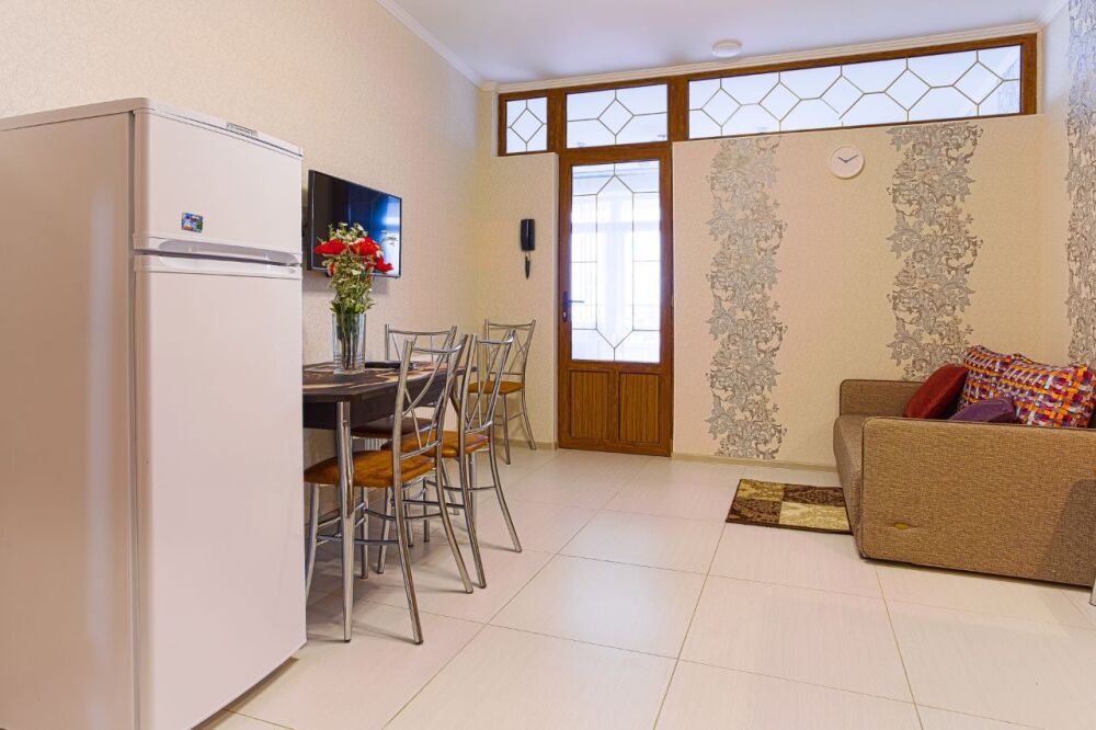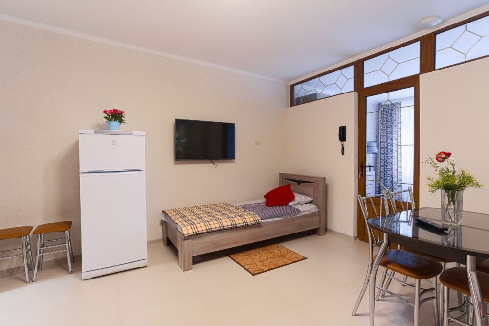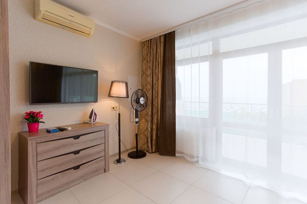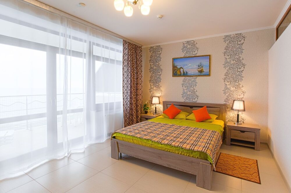 Апартаменты с видом на море находятся на 2-м этаже. Wi-Fi, балкон с видом на море и шезлонгами, телевизор, кондиционер, холодильник, микроволновая печь, чайник, электроплита, посуда, стиральная машина, утюг и гладильная доска, фен. Предоставляем полотенца, постельное белье и средства гигиены. Комната 1: кухня-гостиная (спальные места: раскладной 1-о местный диван). Комната 2: спальня с двуспальной кроватью. Для детей предоставляем детскую кроватку, стул для кормления и горшок. На территории: парковка, мангальная зона.