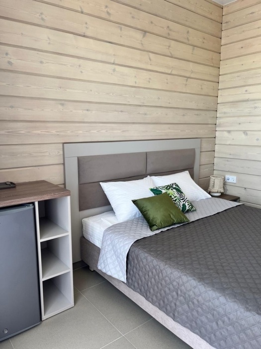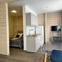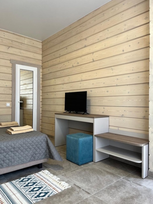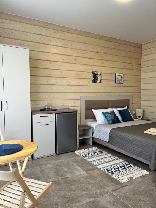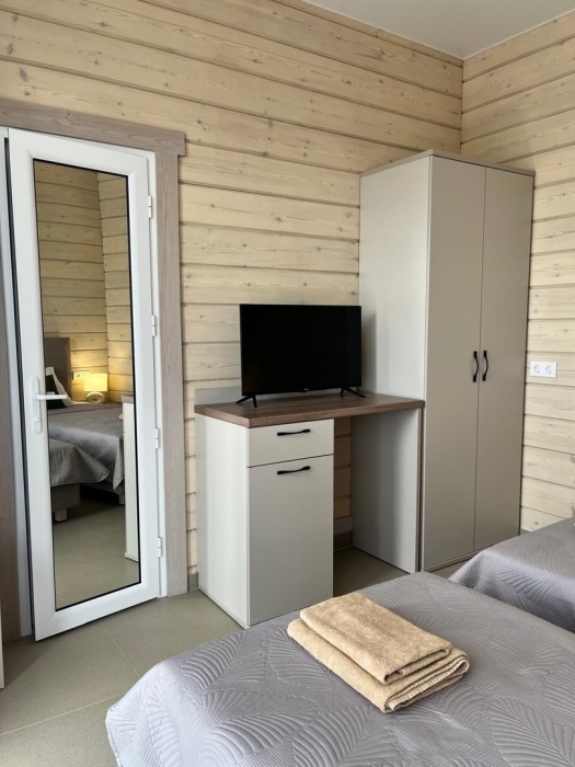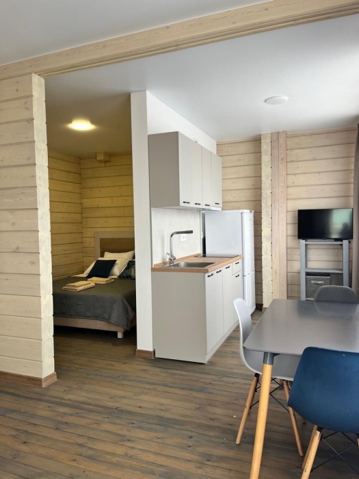 Двухместный номер с оборудованной кухней и обеденной зоной расположен на первом этаже. Небольшая панорамная терраса на входе ,с видом на территорию оборудована комплектом складной мебели из дерева.