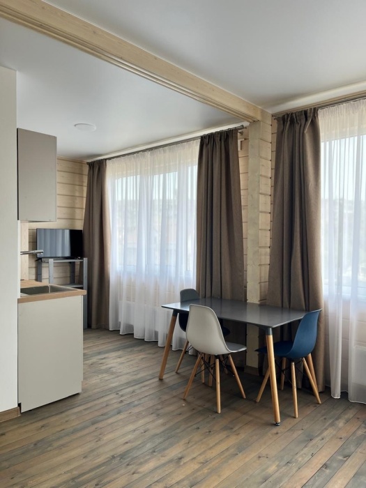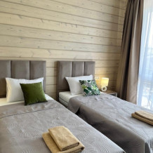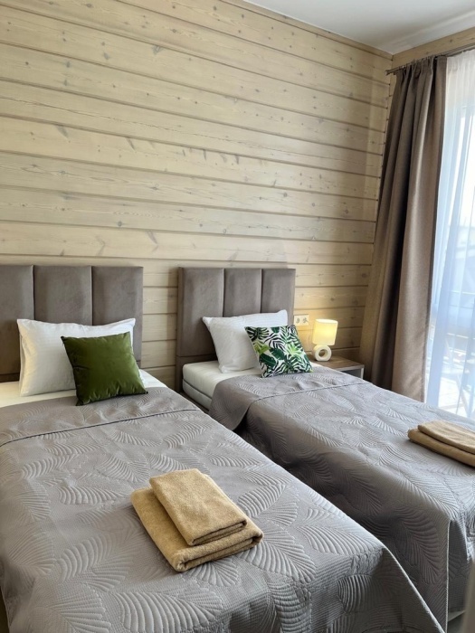 Четырехместный номер с оборудованной кухней и обеденной зоной расположен на первом этаже. Двуспальная кровать с ортопедическим матрасом, двуспальный диван, шкаф, холодильник, кухонная и столовая зона со всем необходимым,телевизор.