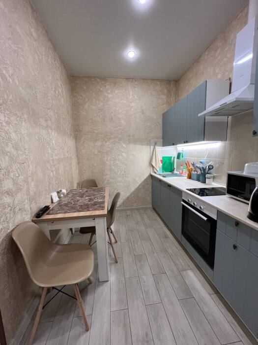 В квартире: Wi-Fi, Smart TV, двуспальная кровать 160*200, раскладной диван 140*200, кресло-кровать 90*200, рабочее место для работы за ноутбуком, розетка с проводным интернетом, шкаф, журнальный столик, тумбочка, розетка и светильник у кровати, кухонная мебель и техника для приготовления пищи.
