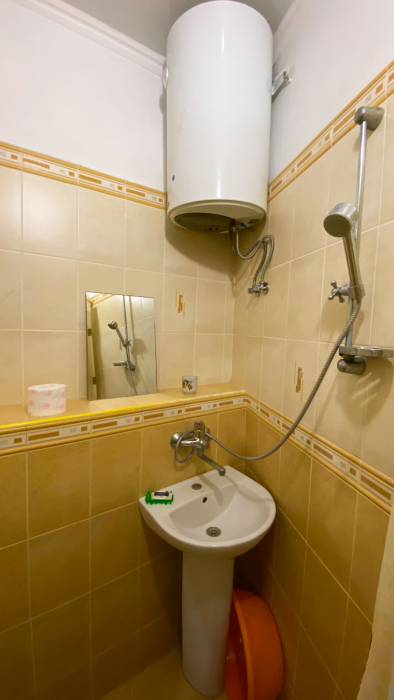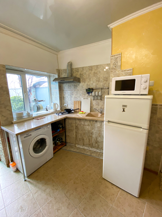 Спальня выходит в кухню. На кухне есть холодильник, кондиционер, газовая плита, водонагреватель, СВЧ, стиральная машина, вся необходимая посуда, стол, стулья.
