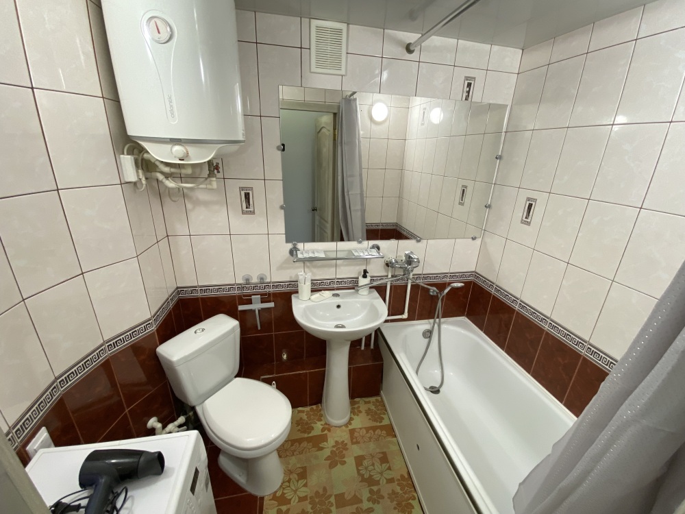 Вся необходимая техника: кондиционер, ТВ ЖК, холодильник, варочная поверхность, микроволновка, стиральная машинка-автомат, утюг, фен, гладильная доска.