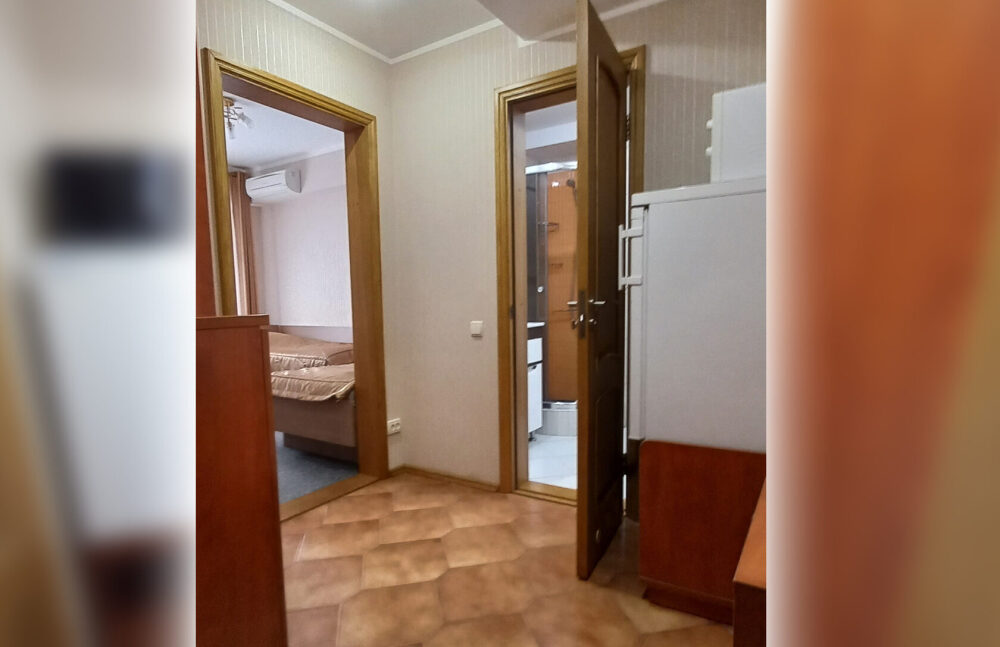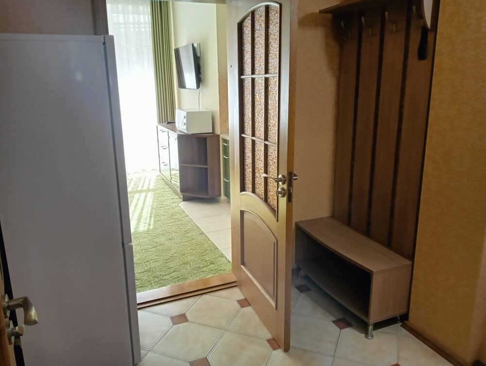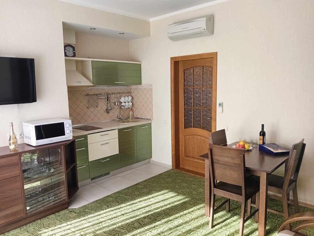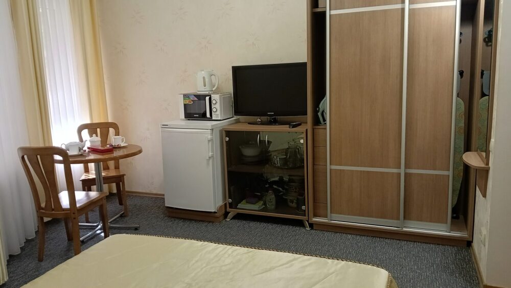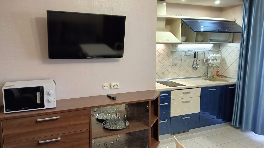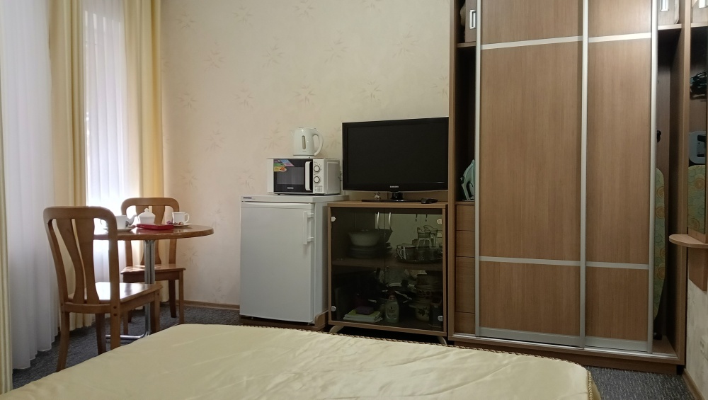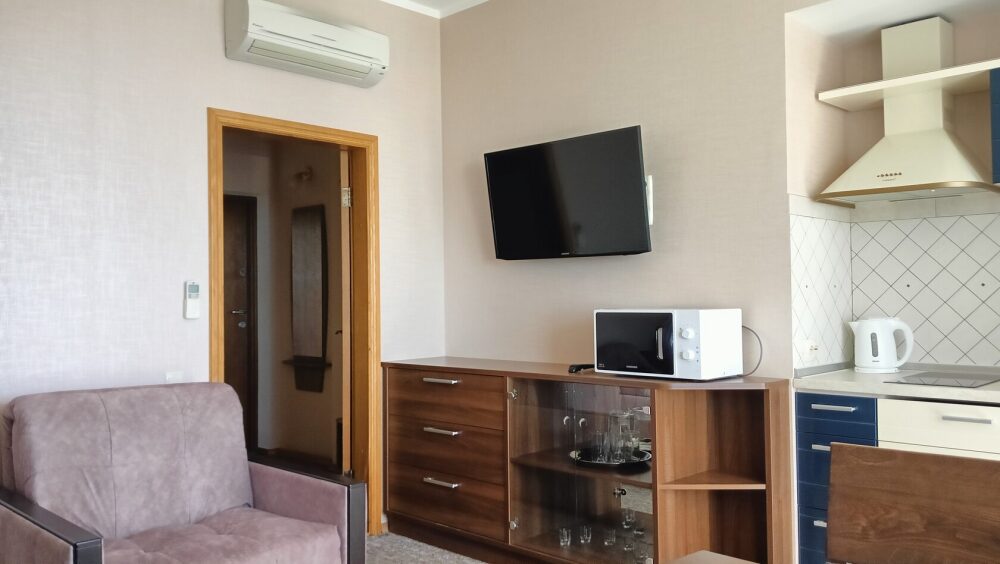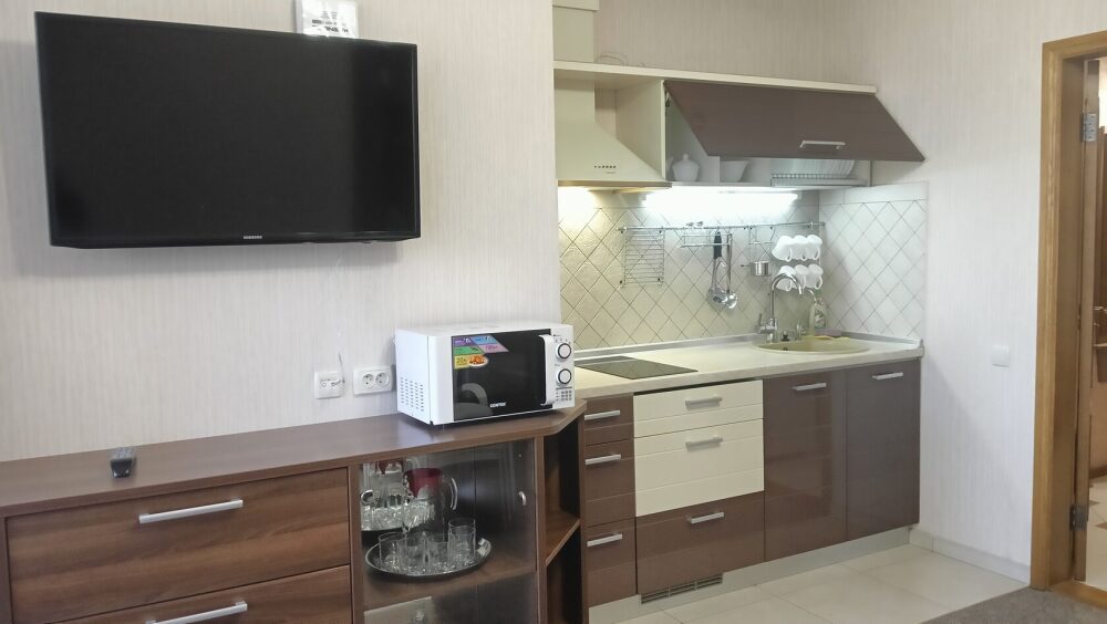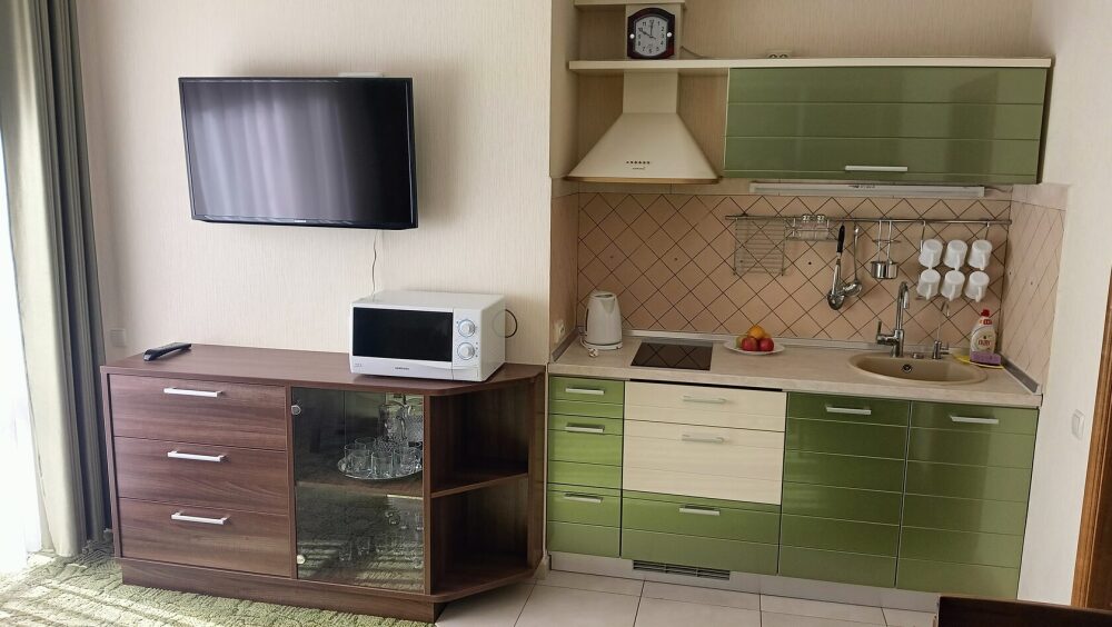 Однокомнатный номер со всеми удобствами, в номере есть холодильник, микроволновка, набор посуды для двоих, чайник, кондиционер,wi-fi, стиральная машина.