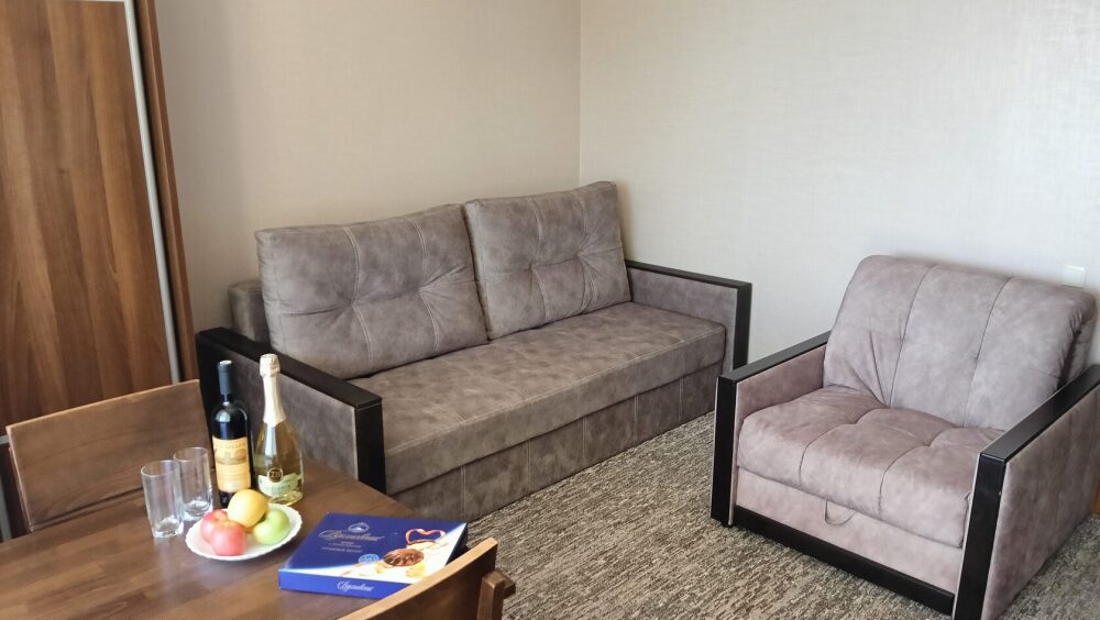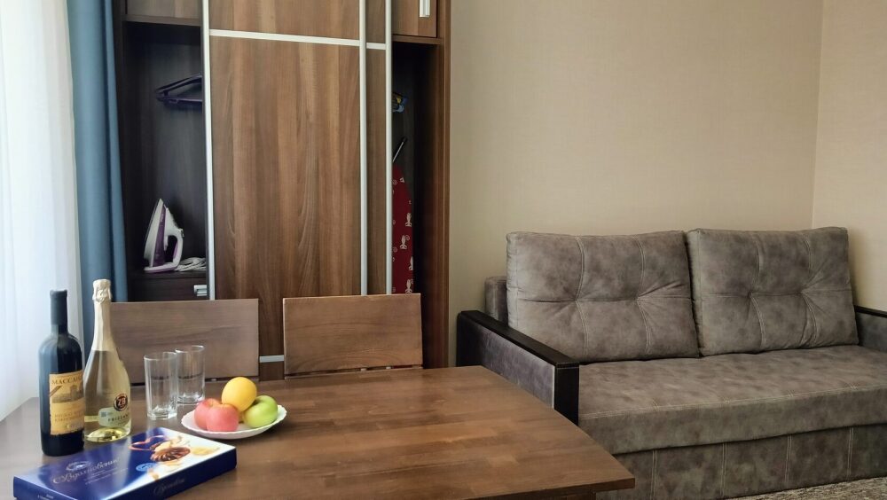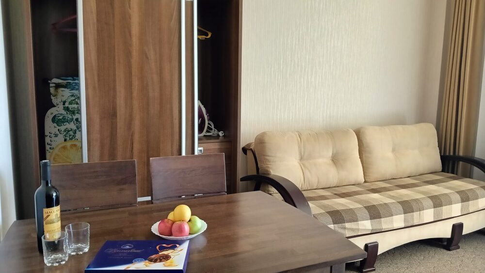 Комнаты укомплектованы удобными кроватью и диваном, шкафами-купе, барной стойкой, телевизорами, кондиционерами, есть гладильная доска и утюг.