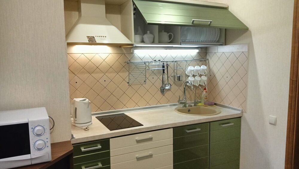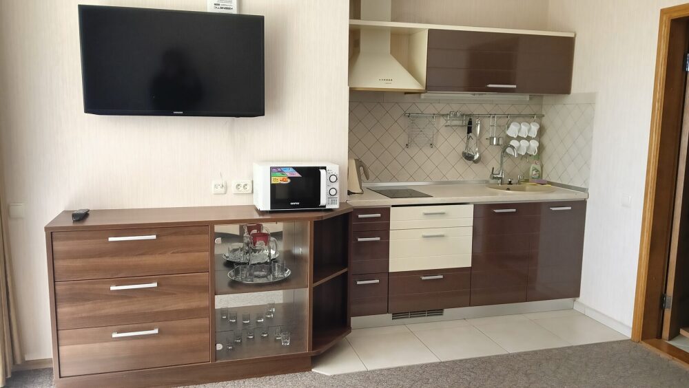 Кухонный уголок располагает всем необходимым для приготовления, разогрева и приема пищи.Набор посуды и ее качество удовлетворит любого.