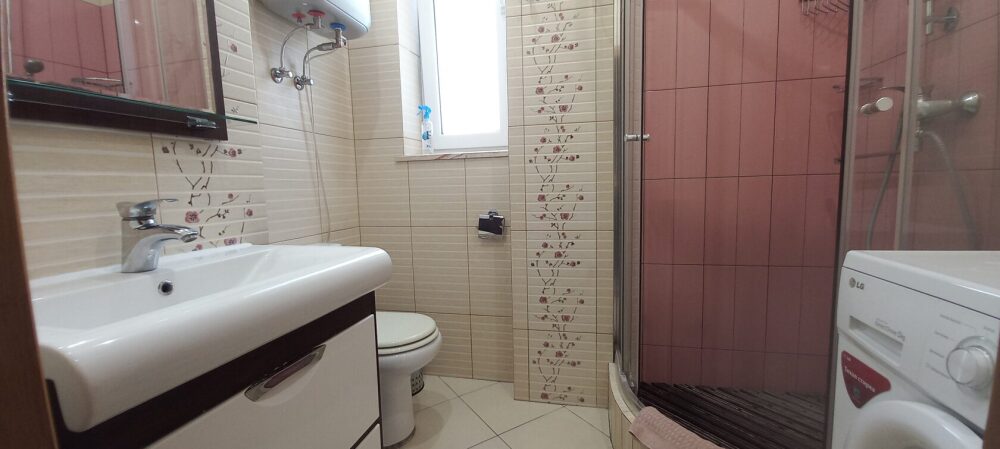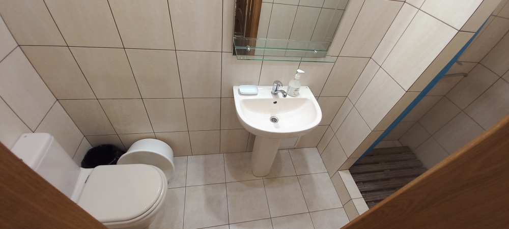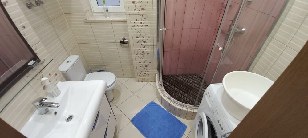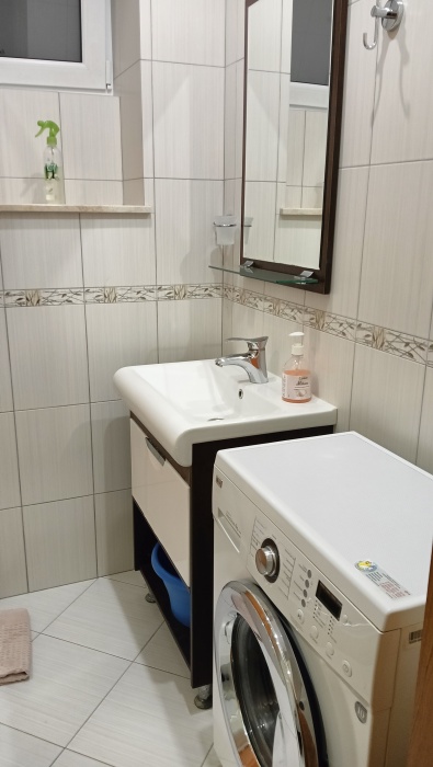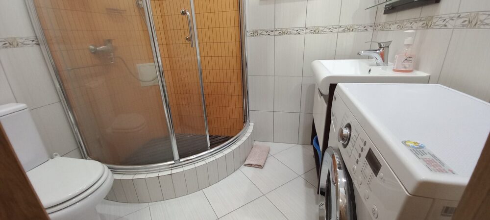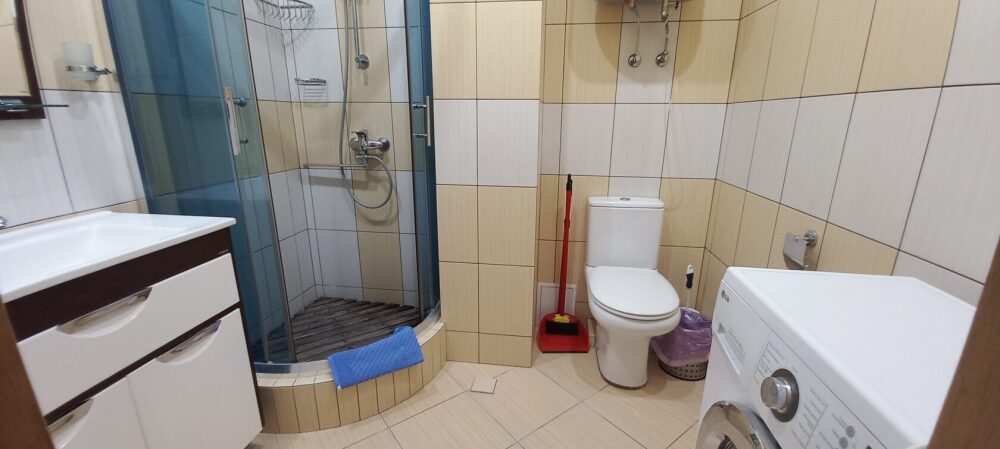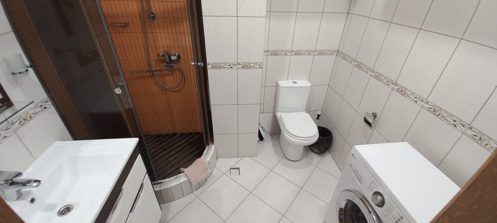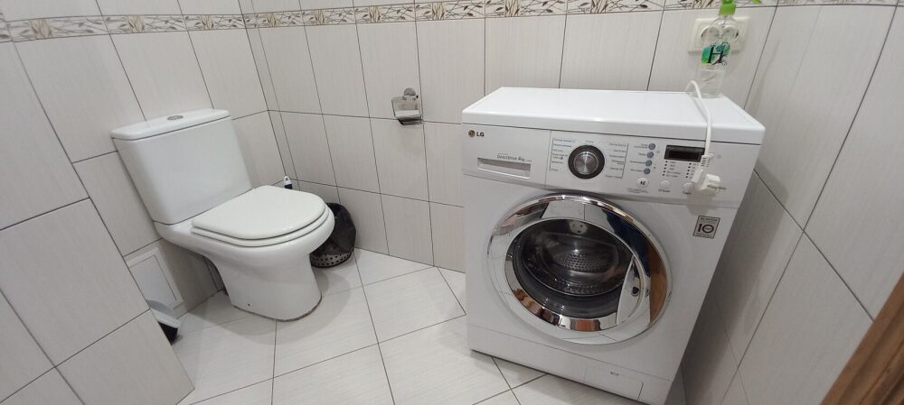 Современный санузел имеет все необходимое: унитаз, душевую кабину, умывальник, зеркало, стиральную машину. Подача холодной и горячей воды осуществляется круглосуточно.