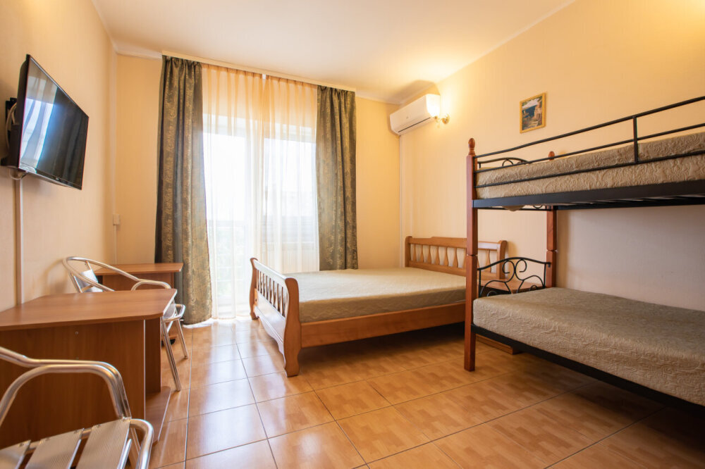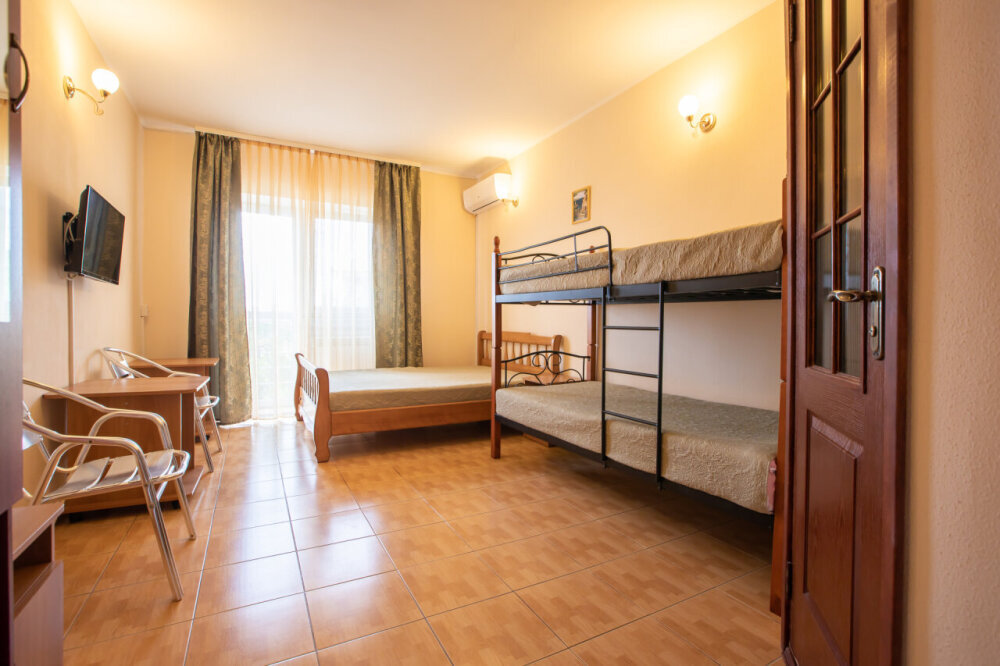 Однокомнатный семейный номер с балконом. расположен на втором этаже. Номер со всеми удобствами. В номере двуспальная кровать , двухъярусная кровать, журнальный столик, шкаф, стулья. А так же холодильник, телевизор, кондиционер, душевая кабинка и туалет.