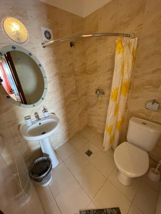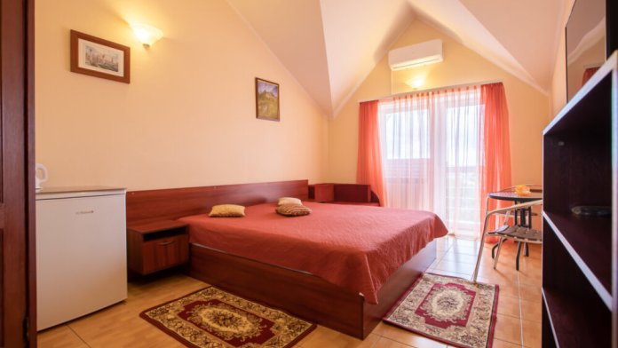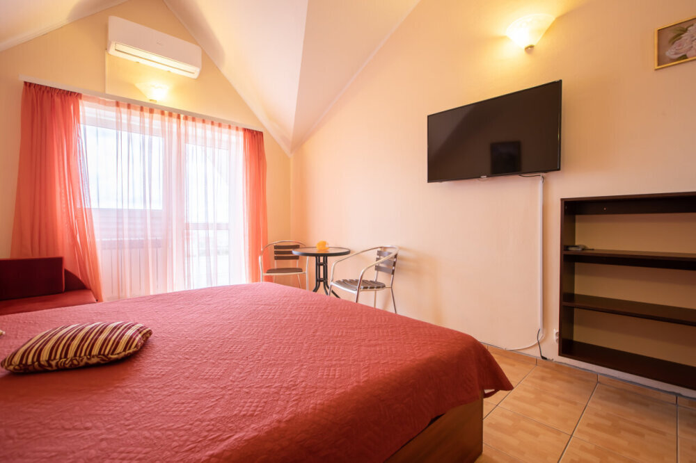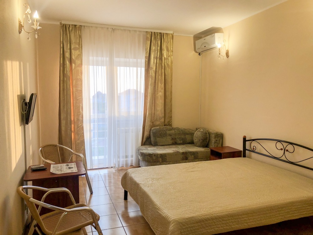 Однокомнатный номер с балконом , расположен на четвертом этаже. В номере двуспальная кровать, одноместный раскладной диван, шкаф, журнальный столик, вешалка. А так же холодильник, телевизор, кондиционер, туалет и душевая кабинка.