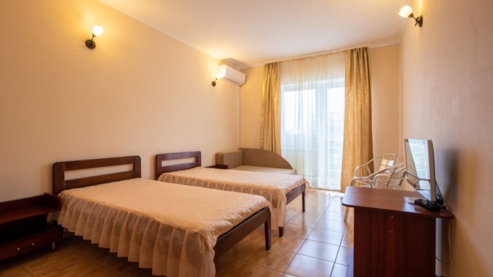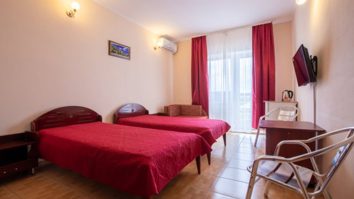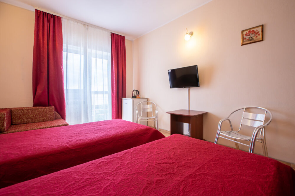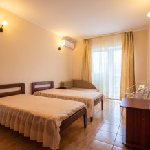 Однокомнатный двухместный номер с балконом , расположен на третьем этаже. В номере две односпальные кровати, одноместный раскладной диван, шкаф, журнальный столик, вешалка. А так же холодильник, телевизор, кондиционер, туалет и душевая кабинка.