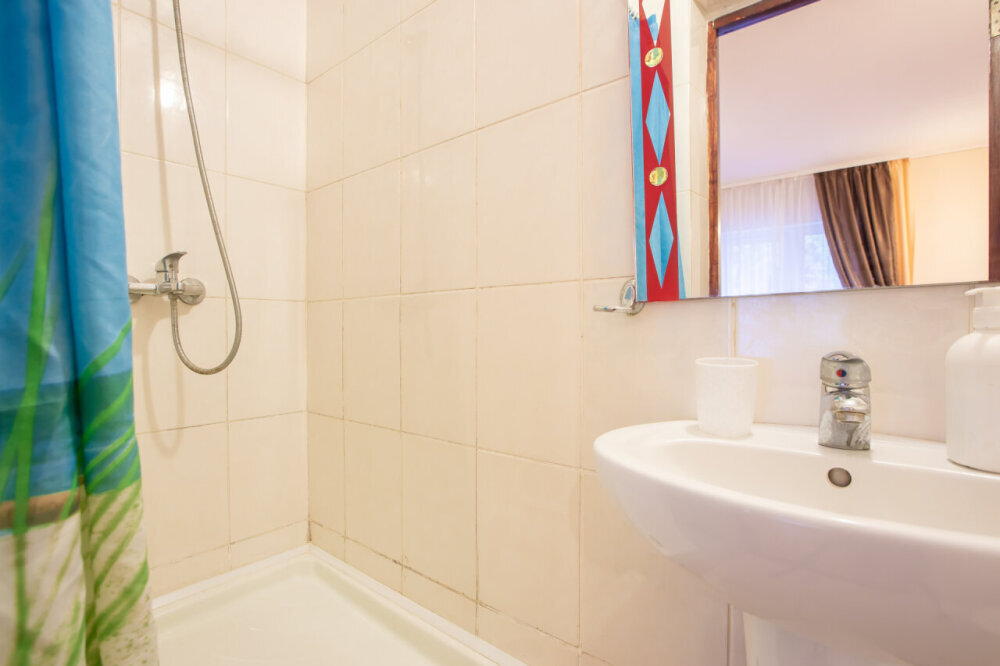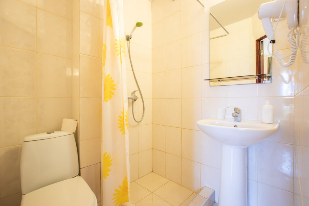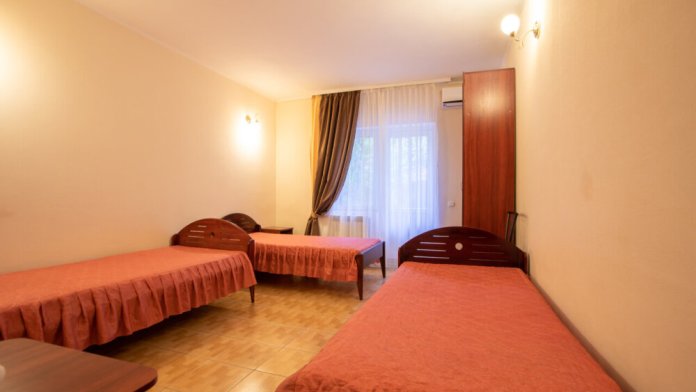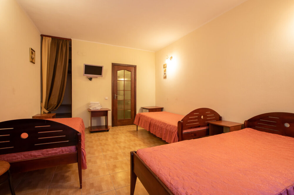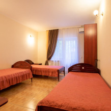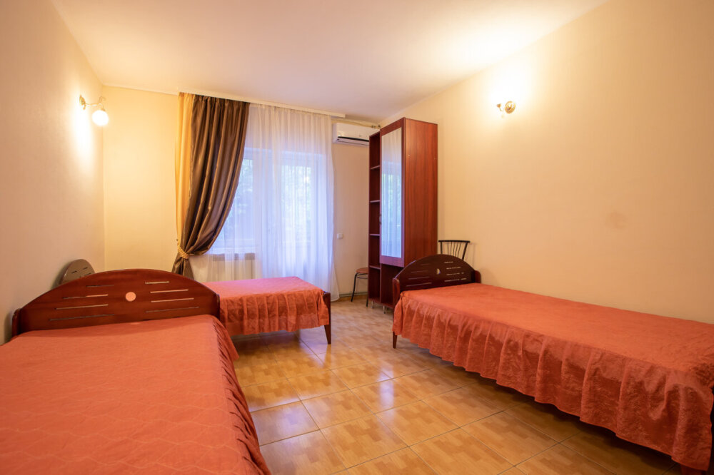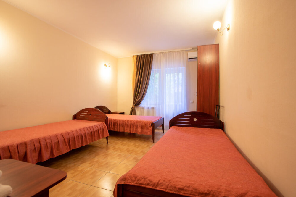 Однокомнатный номер расположен на первом этаже. В номере три односпальные кровати, шкаф, журнальный столик, вешалка. А так же холодильник, телевизор, кондиционер, туалет и душевая кабинка.