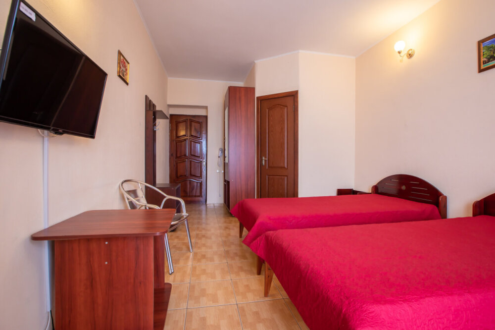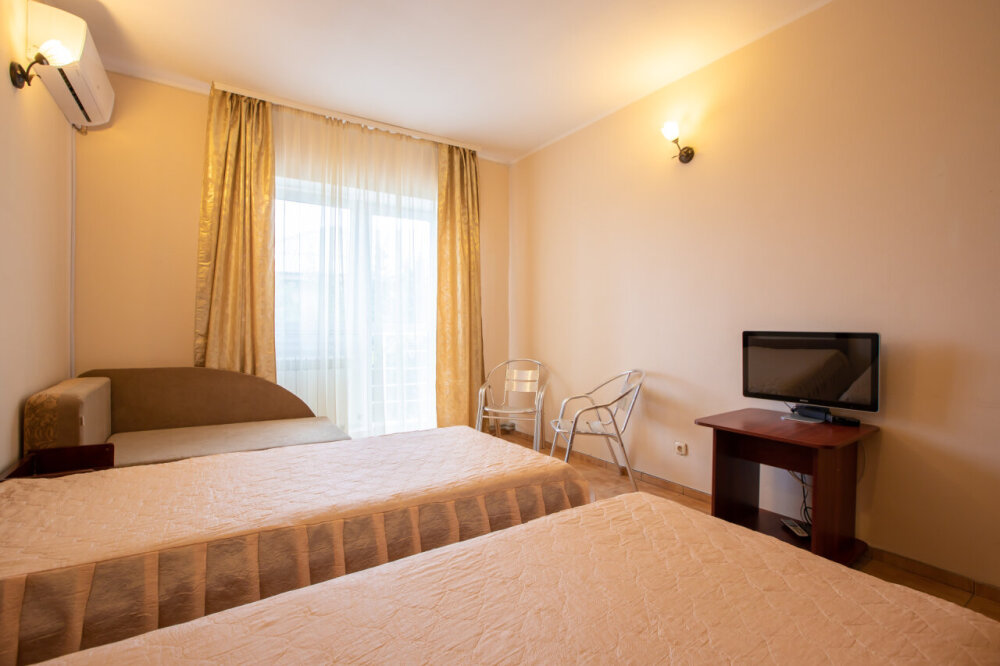 Однокомнатный двухместный номер с балконом, расположен на втором этаже. В номере две односпальные кровати, одноместный раскладной диван, шкаф, журнальный столик, вешалка. А так же холодильник, телевизор, кондиционер, туалет и душевая кабинка.