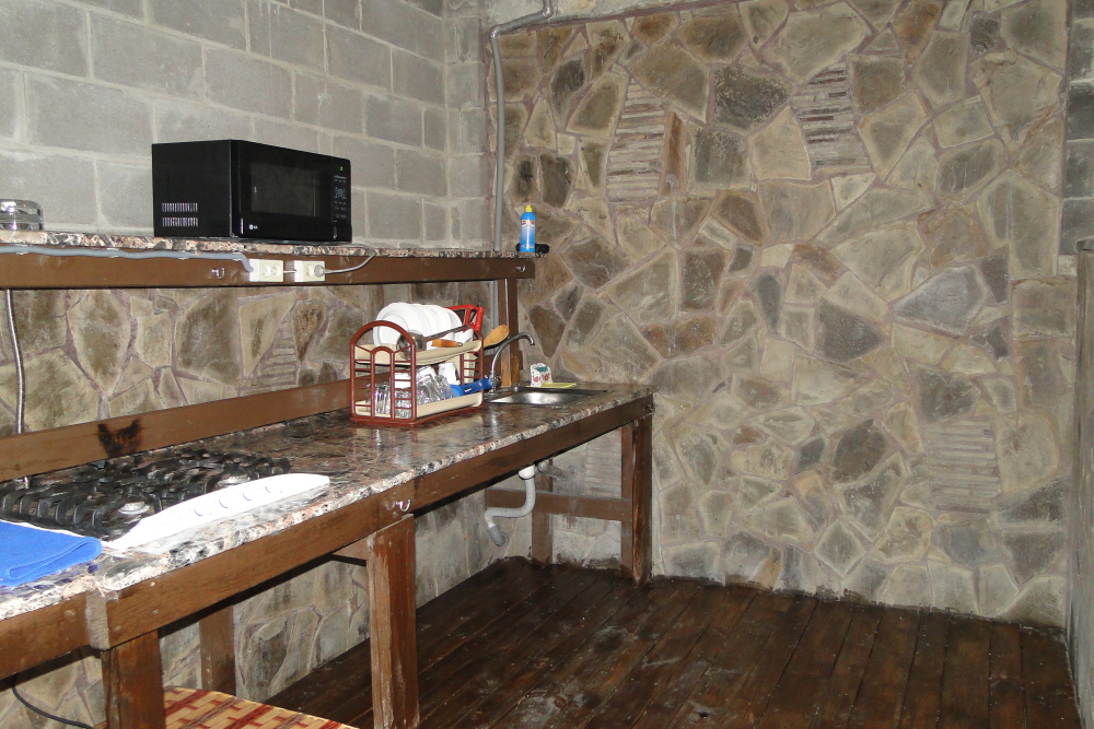 Кухня летняя во дворе: газовая плита, микроволновка, чайник, необходимая посуда.