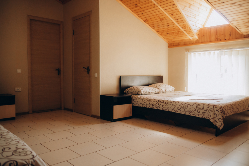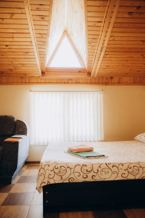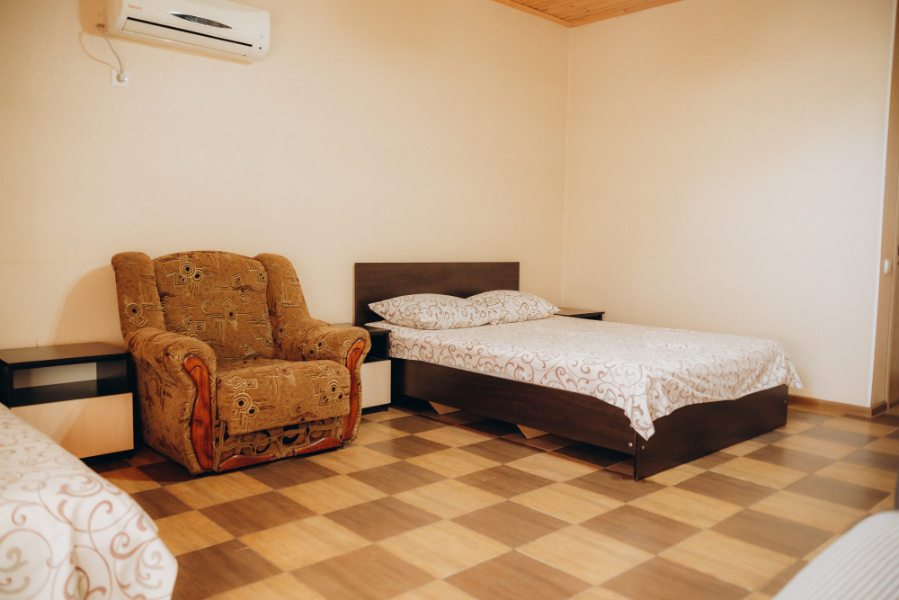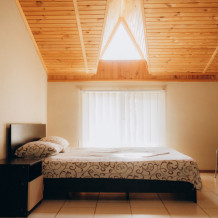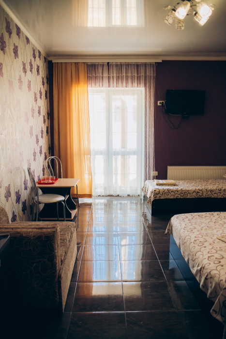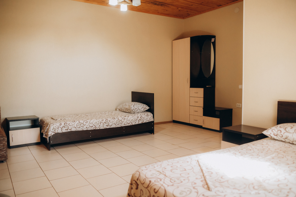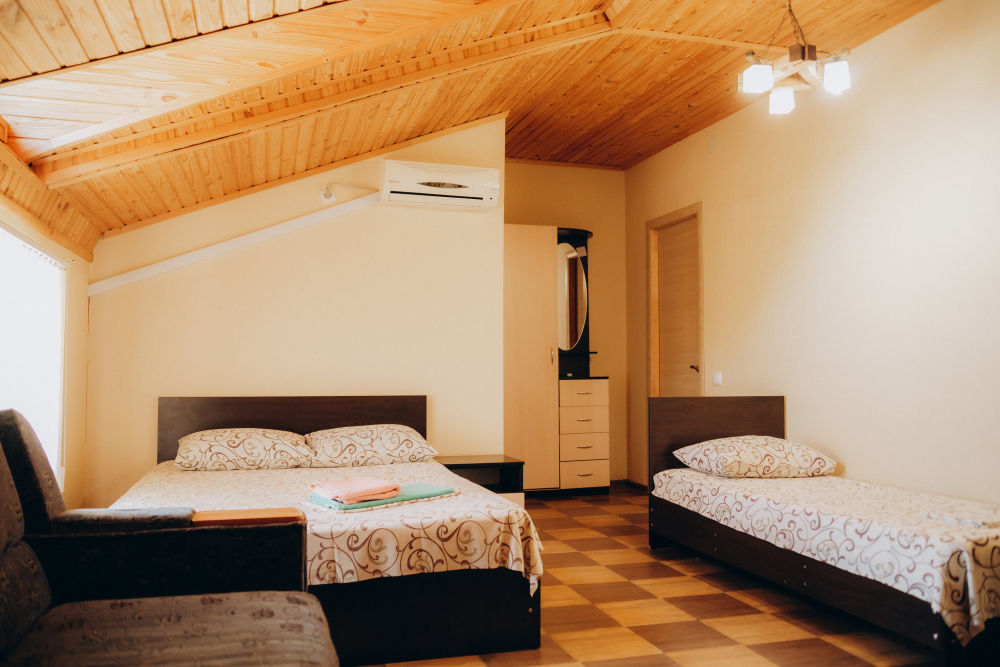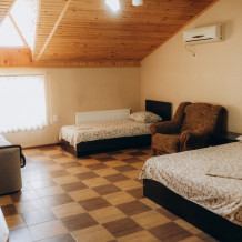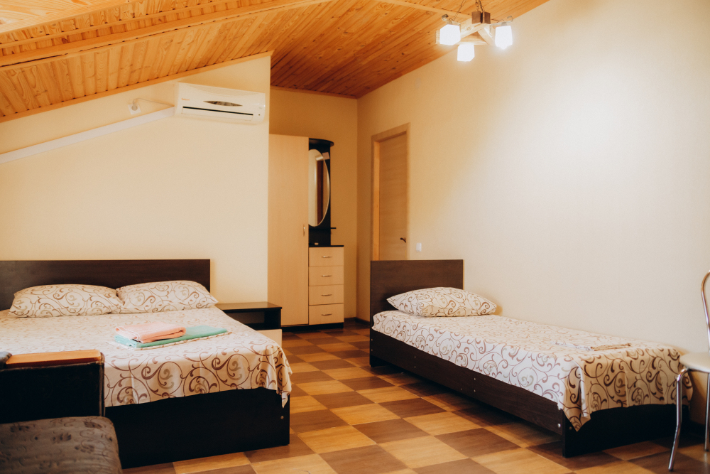 Номер представляет собой комфортное и просторное помещение, идеально подходящее для семейного отдыха или отдыха небольшой компанией. В номере предусмотрены двуспальная и односпальная кровати.