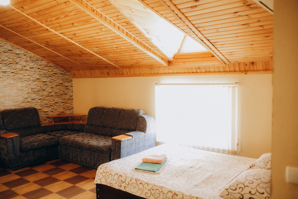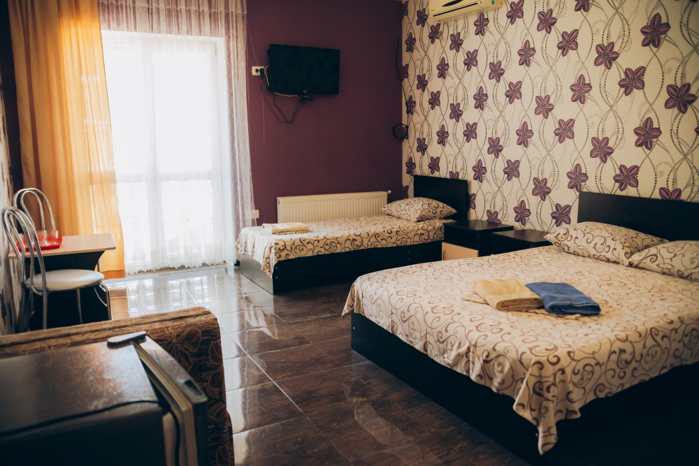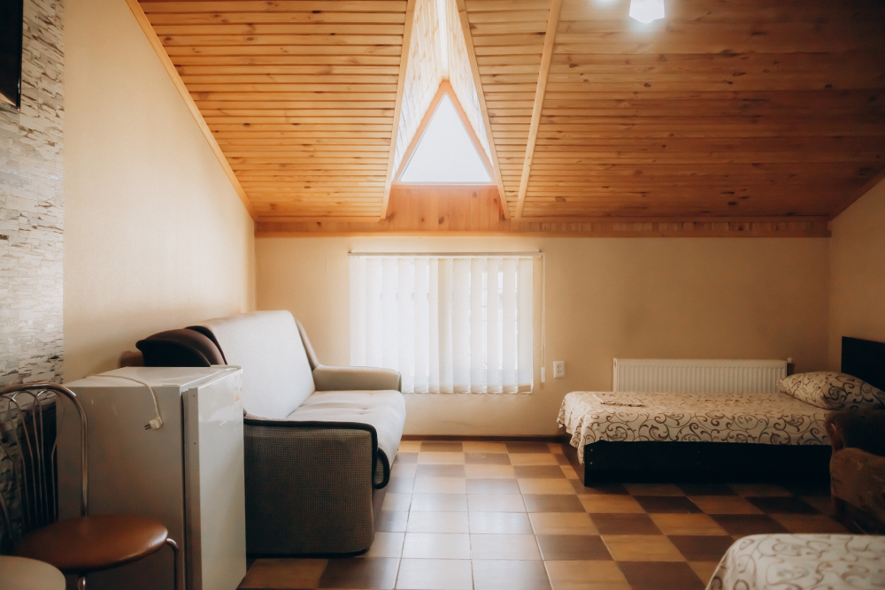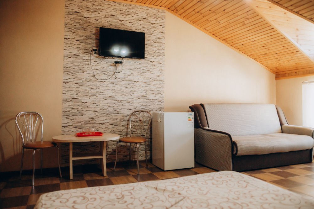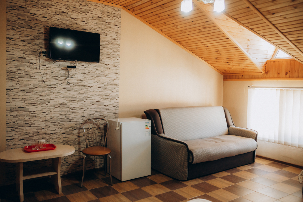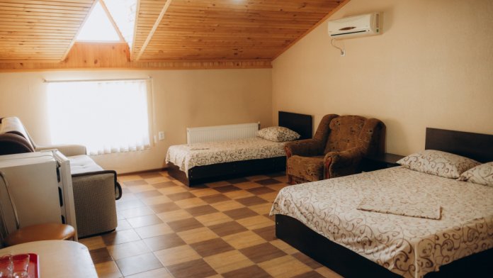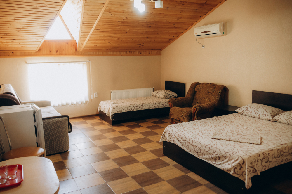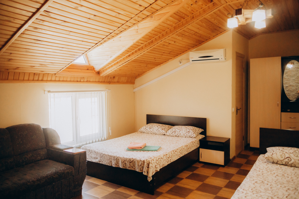 Номер представляет собой комфортное и просторное помещение, идеально подходящее для семейного отдыха или отдыха небольшой компанией. В номере предусмотрены двуспальная и односпальная кровати, а также удобный двуспальный диван, что позволяет разместить до 5 гостей.