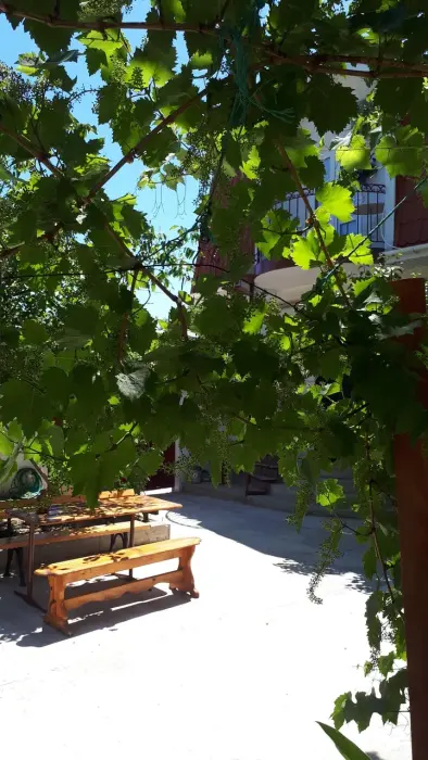 Во дворе дома можно посидеть за большим столом, есть мангал и все необходимое для приготовления барбекю и шашлыка.