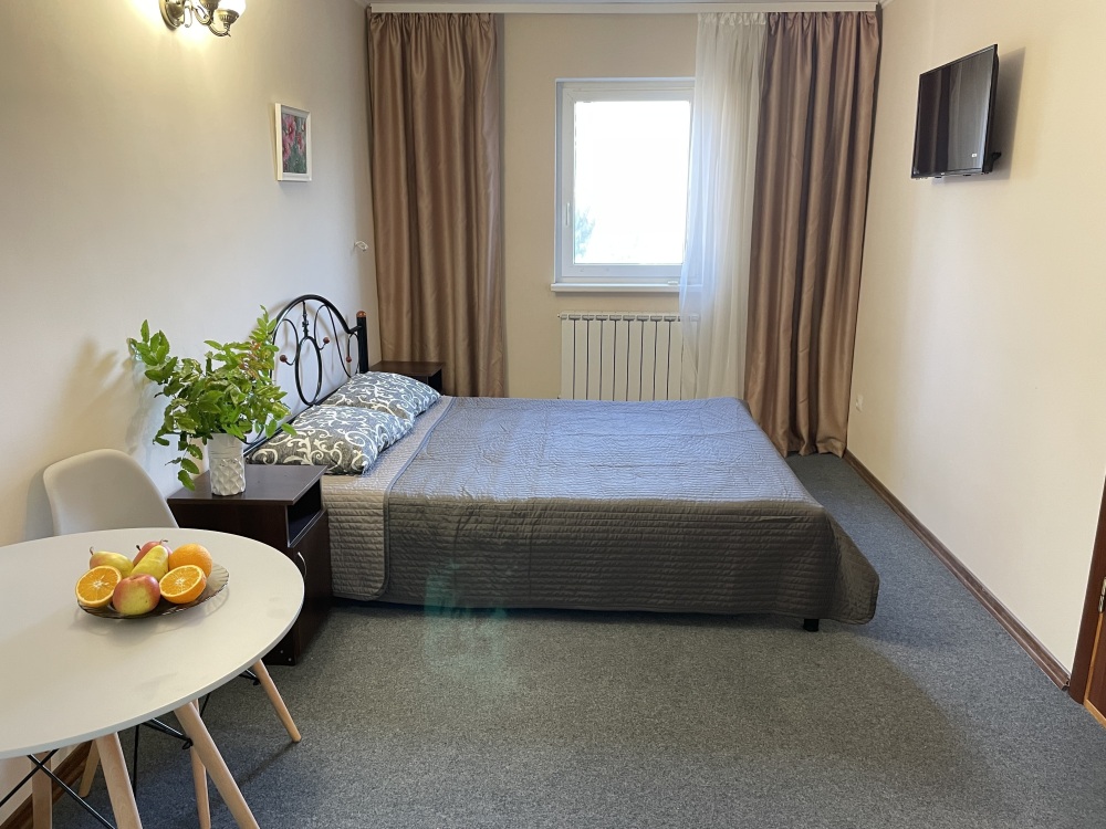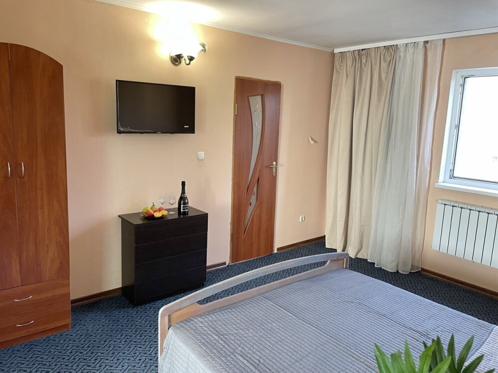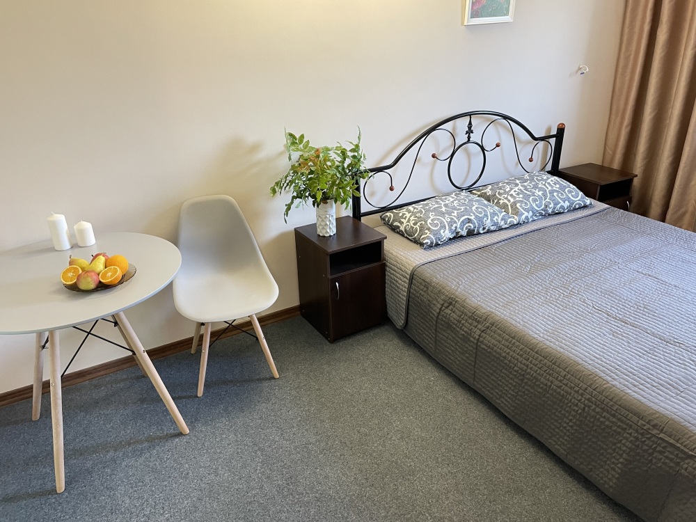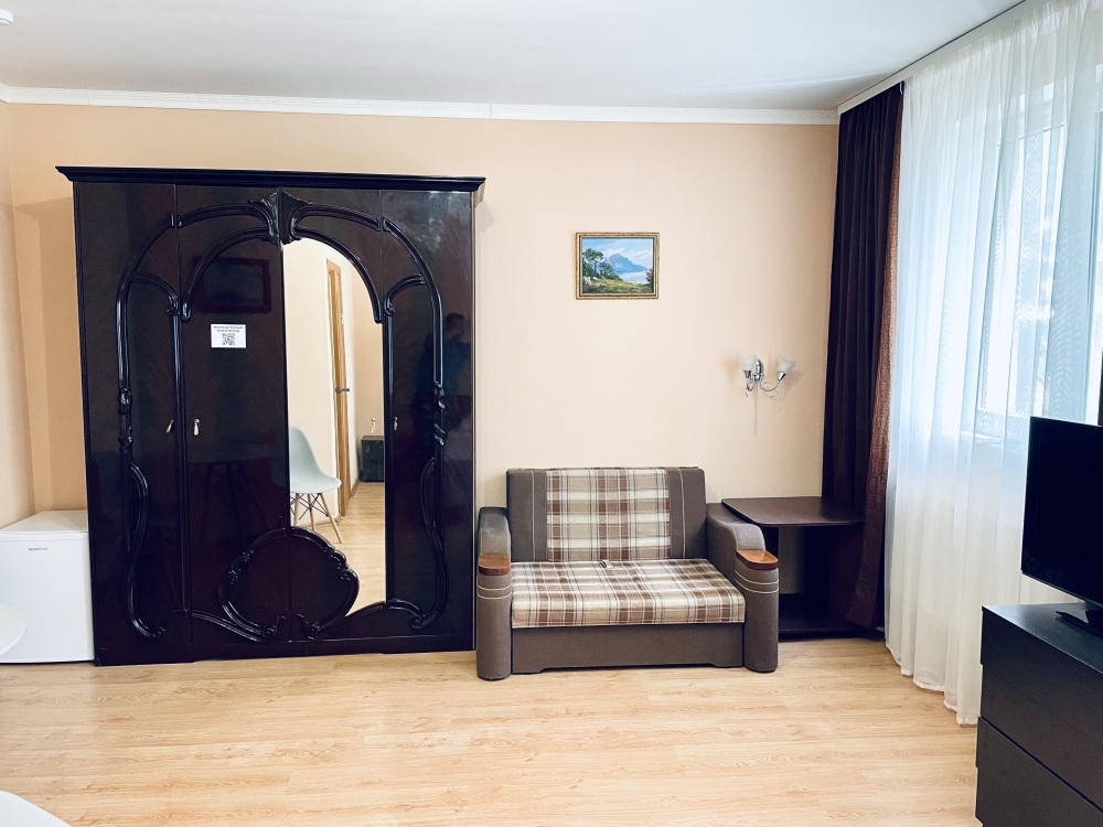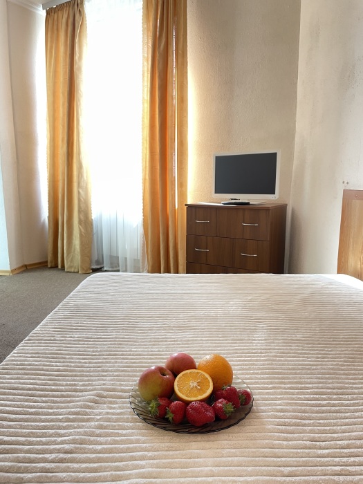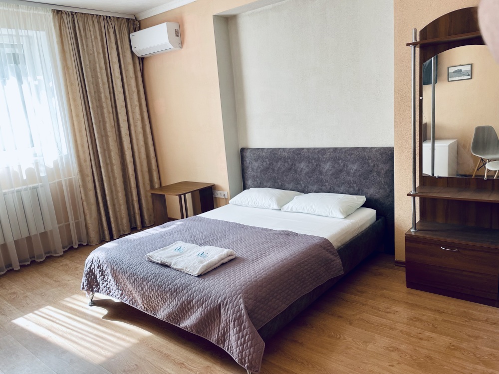 В номере телевизор SmartTV, кондиционер, холодильник, WiFi, шкаф для одежды, комод, стол, 2 стула. По запросу - фен. Окно с видом на город.