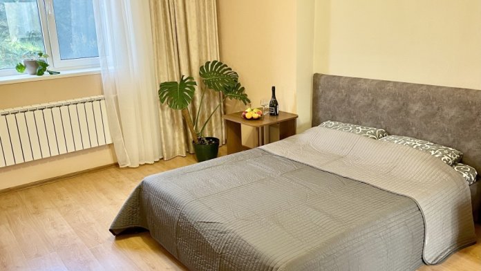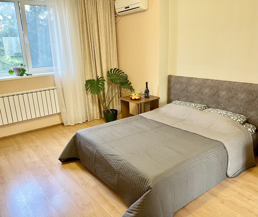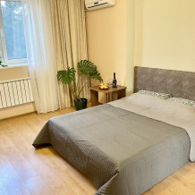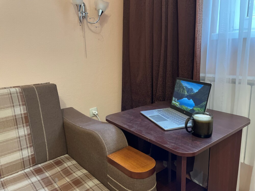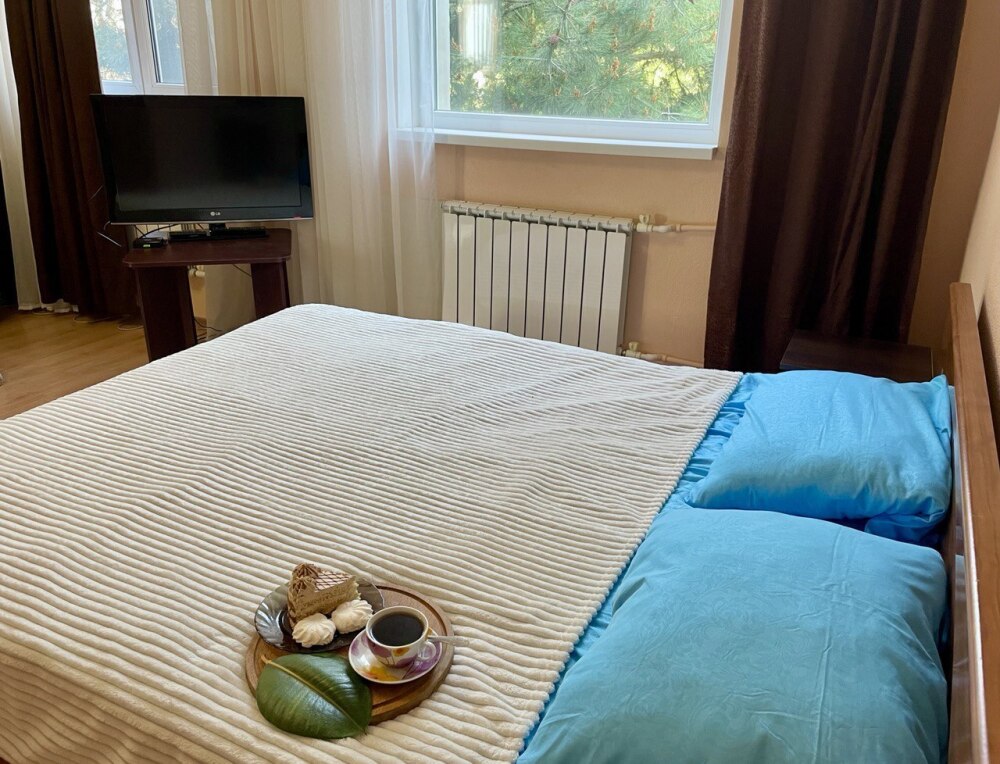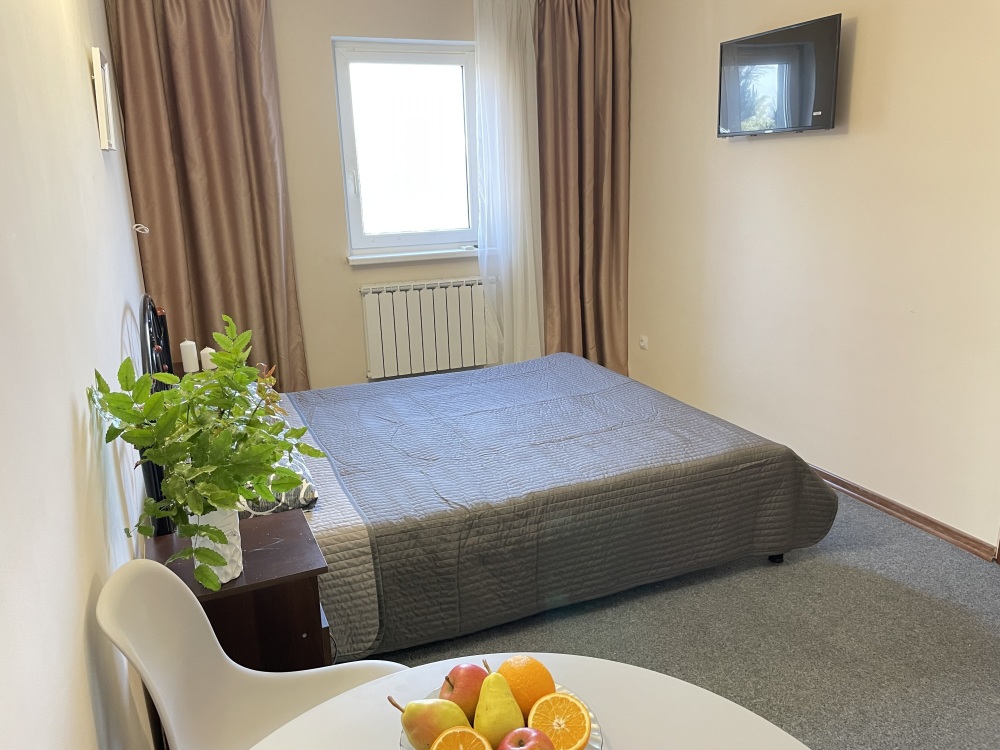В номере телевизор SmartTV, кондиционер, холодильник, WiFi, шкаф для одежды, комод, стол, 2 стула. По запросу - фен. Окно с видом на город.