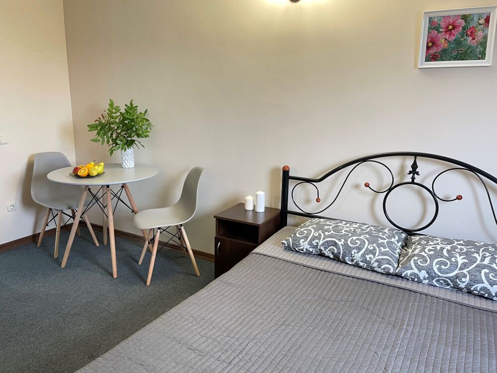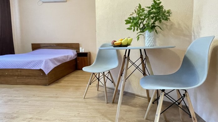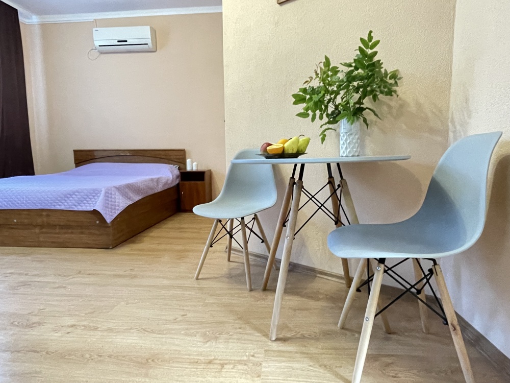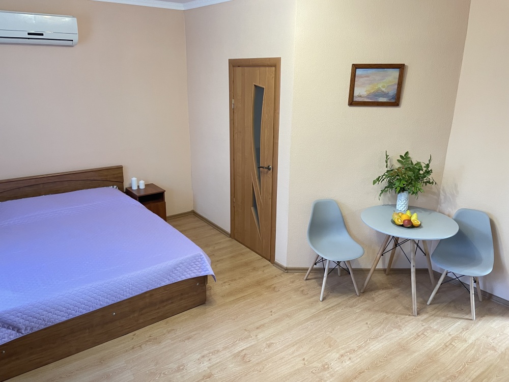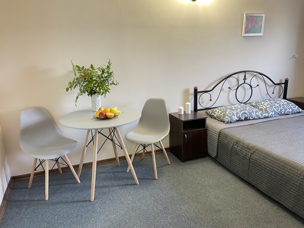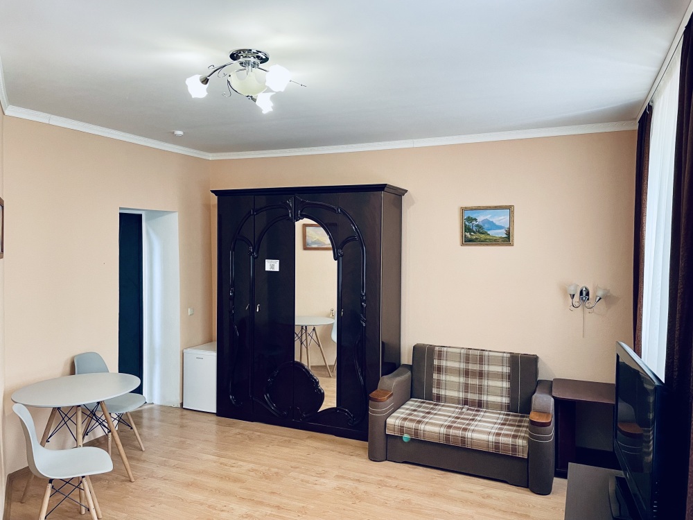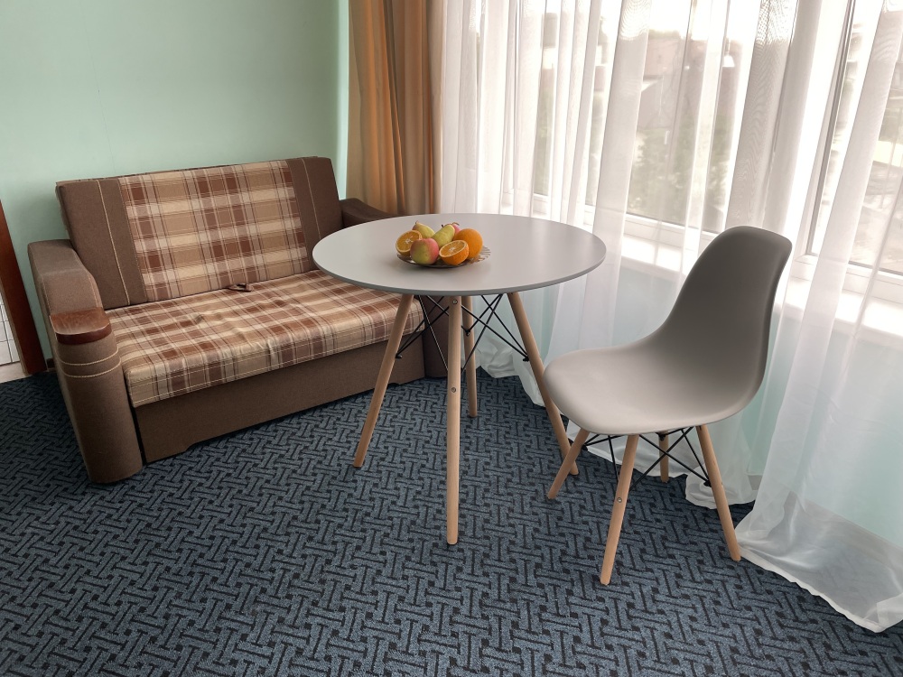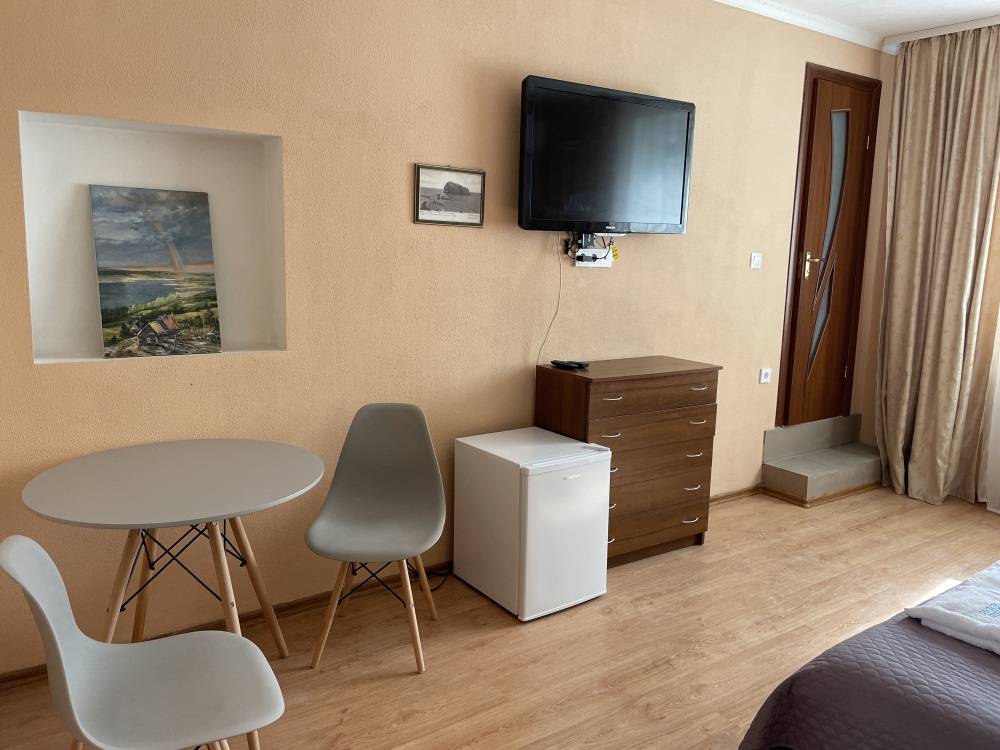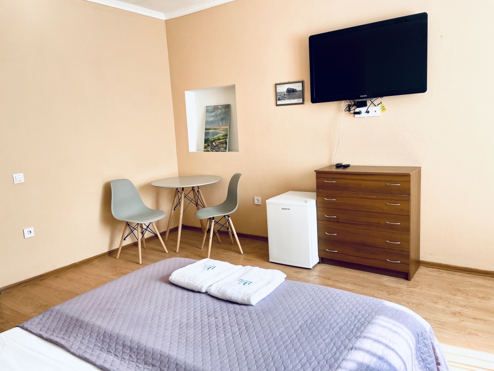 В номере телевизор SmartTV, кондиционер, холодильник, WiFi, шкаф для одежды, стол, 2 стула.