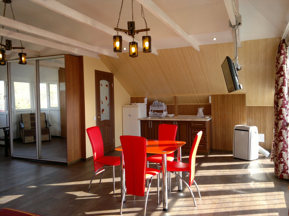 Привлекательная архитектура дома соответствует интерьеру внутренних помещений, каждое из которых обращено к морю и автономно: спальня, мини-кухня, кондиционеры, ТВ, санузел, умывальник, душ, необходимая мебель, балконы. Отдыхающие при желании могут принимать ультрафиолетовые ванны в собственном солярии: крыша дома - обзорная площадка-солярий с восхитительным видом на море, шезлонгами, ночной подсветкой.