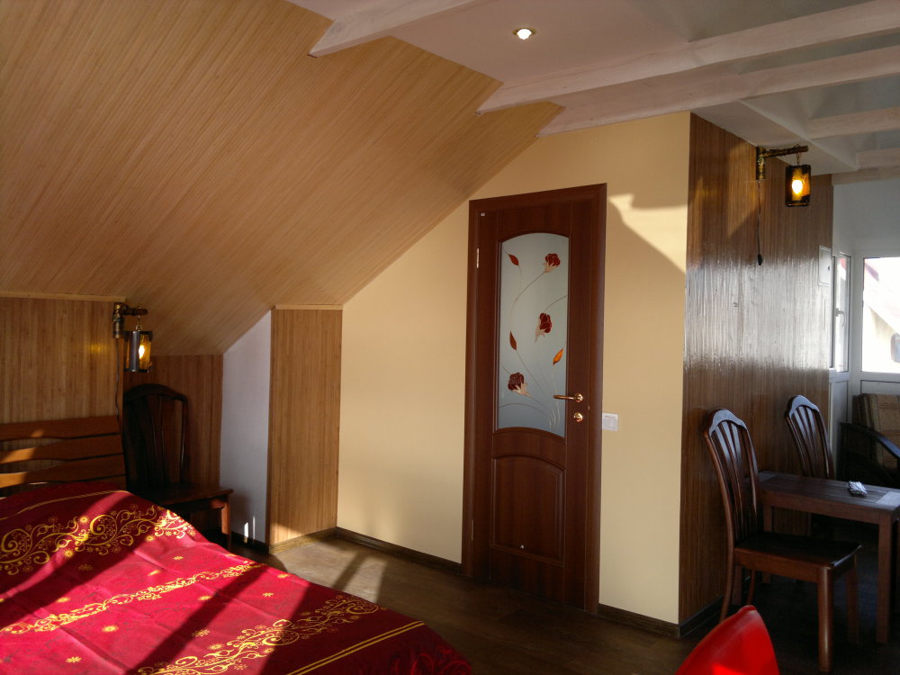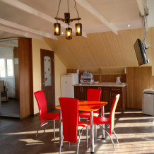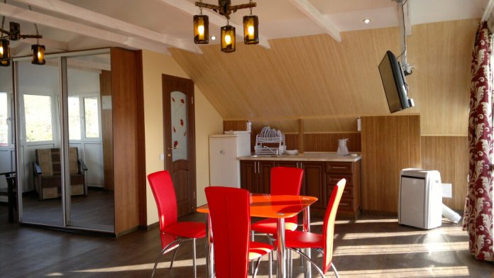 В номере: тумбочки, шкаф с антресолью, стол обеденный, стулья, тумба для обуви, таз для стирки, стол кухонный с раковиной, шкаф для посуды, стол для балкона, кресла для балкона, посуда, горячая вода из бойлера и солнечной батареи, мини-кухня.