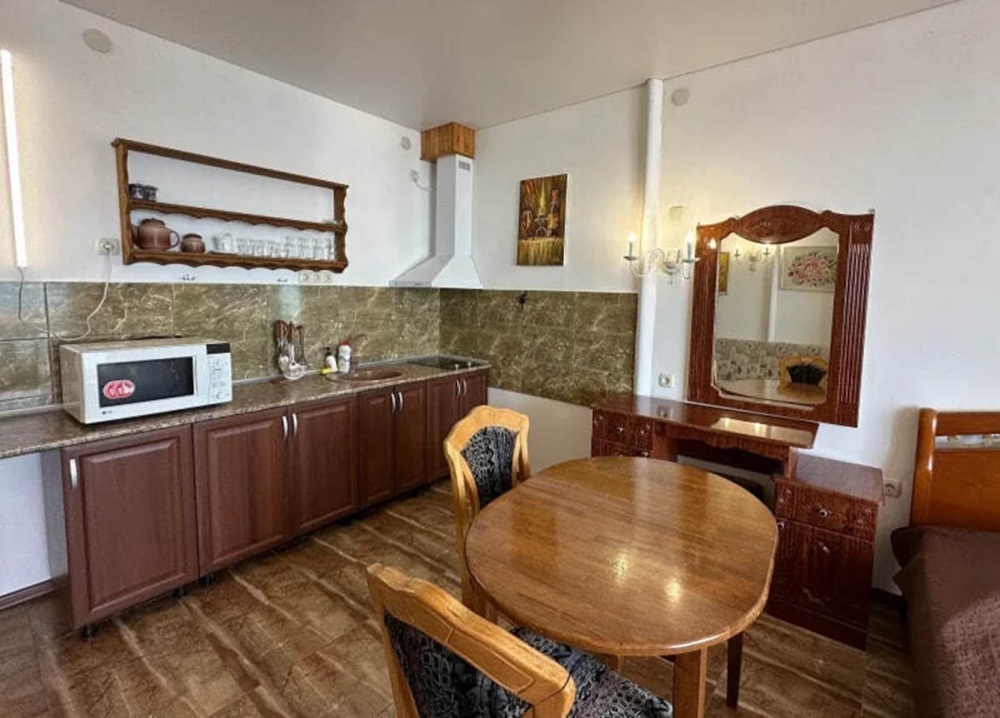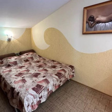 Комфортабельный однокомнатный 2-х местный номер Люкс с балконом, площадью 31 кв. м с одной 2-х спальной кроватью (спальное место 1,80 на 2,0м), и раскладным диваном. Номер оборудован кухней со всем необходимым для приема и приготовления пищи, полным комплектом посуды, холодильником, эл. плитой и вытяжкой. Просторный санузел с душем, укомплектован стиральной машиной. В номере есть кондиционер, бесплатный WiFi, телевизор. Номер предназначен для 2 человек, с возможностью размещения 1 человека на дополнительном месте.