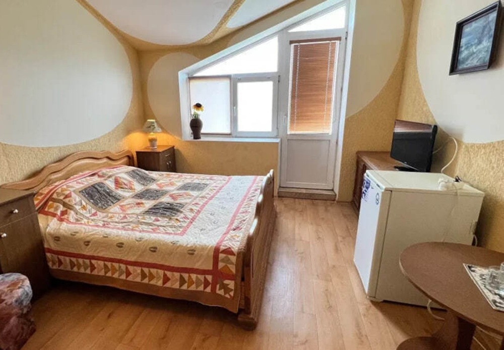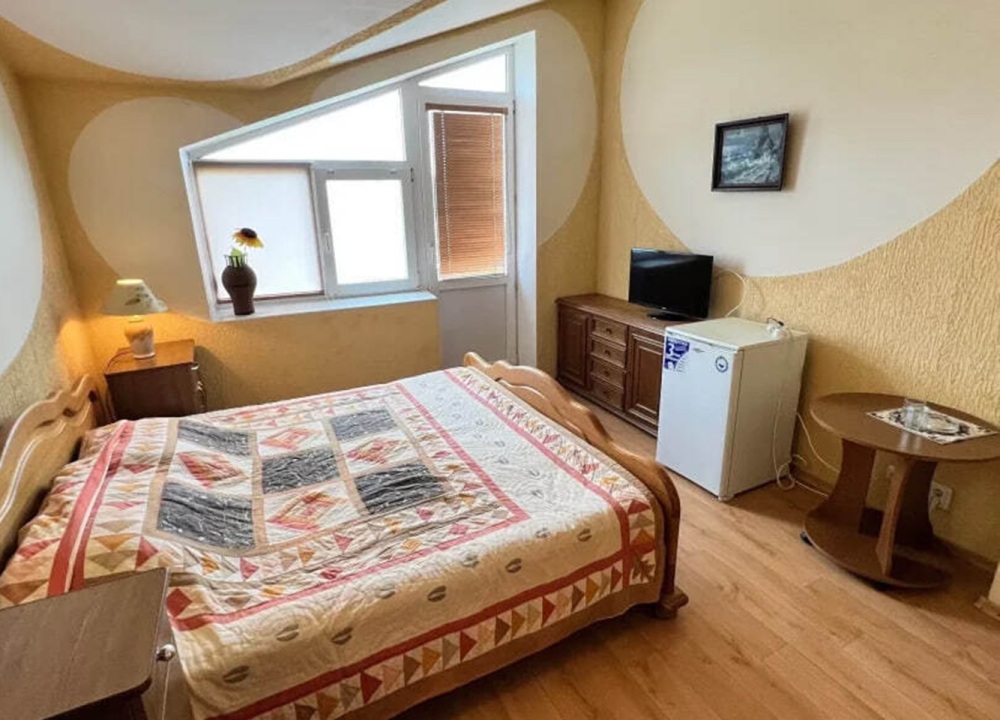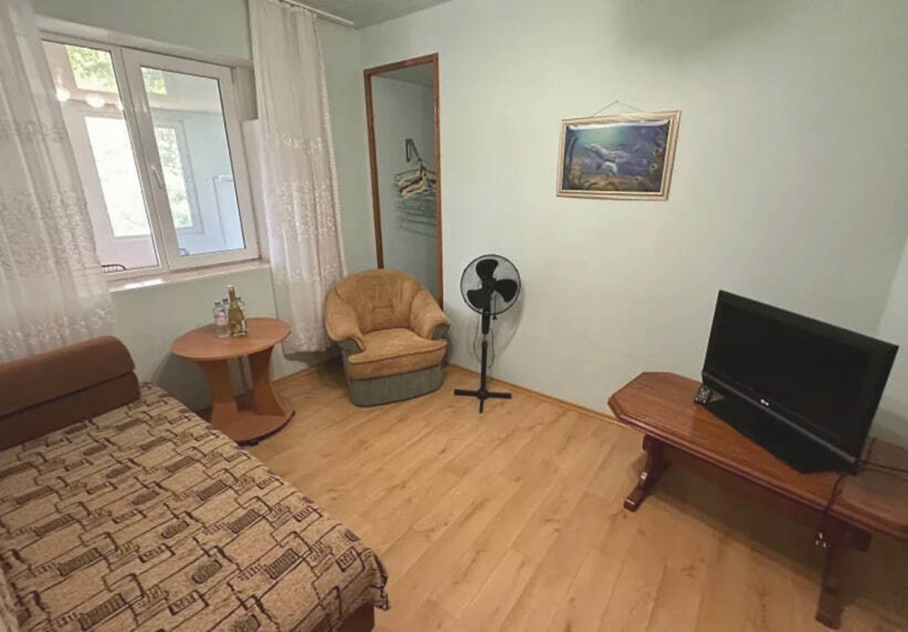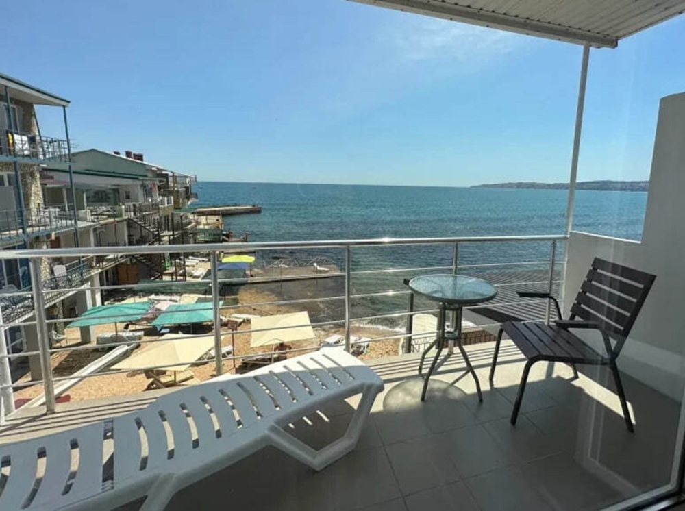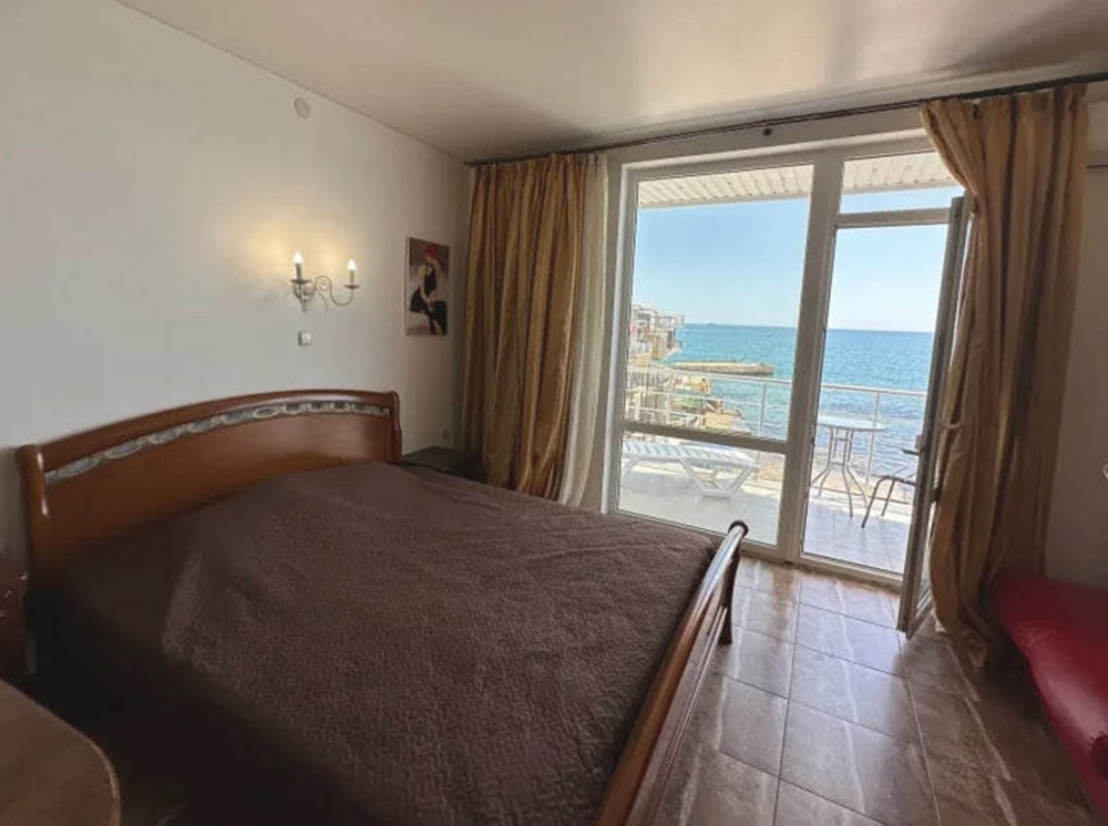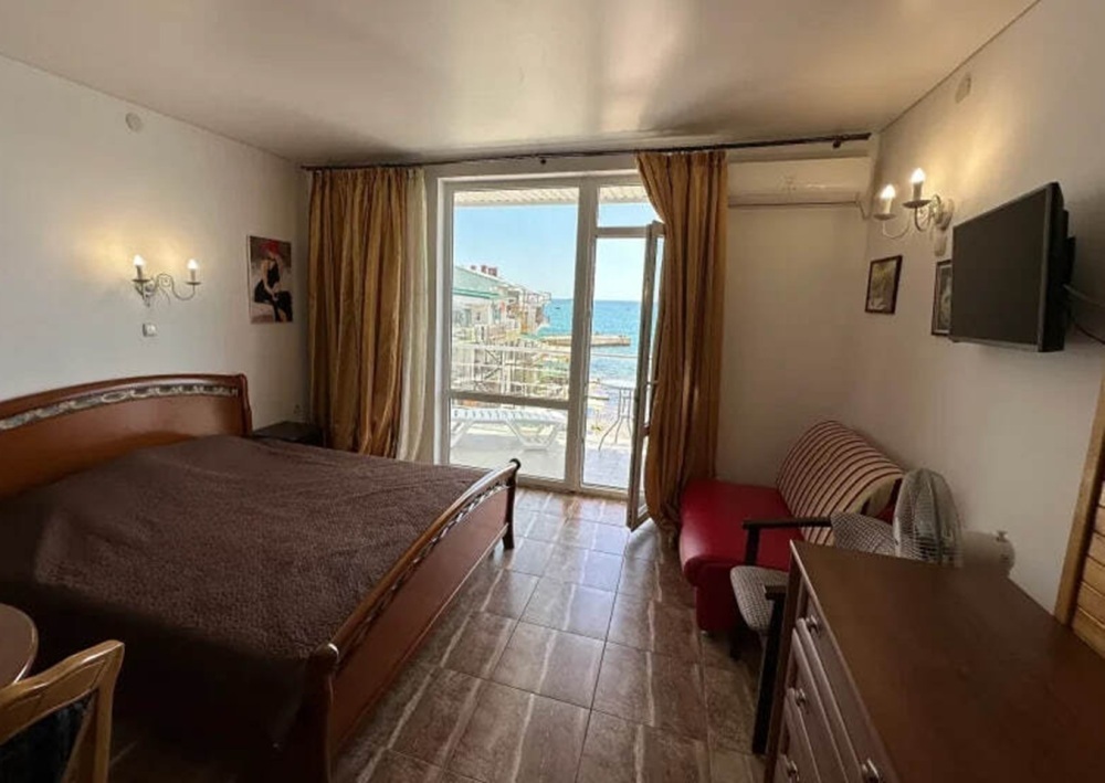 Номер расположен на 2-м этаже. Номер с большим балконом и видом на море. Отдельный вход со стороны моря (винтовая лестница). В номере кровать (спальное место 160 см), угловой раскладной диван. Также в номере есть: кухня, с необходимой посудой эл. плитой и эл. чайником, телевизор, кондиционер, холодильник, санузел (душ,туалет), горячая и холодная воды круглосуточно. Номер предназначен для 2 человек, с возможностью размещения 1 человека на дополнительном месте.