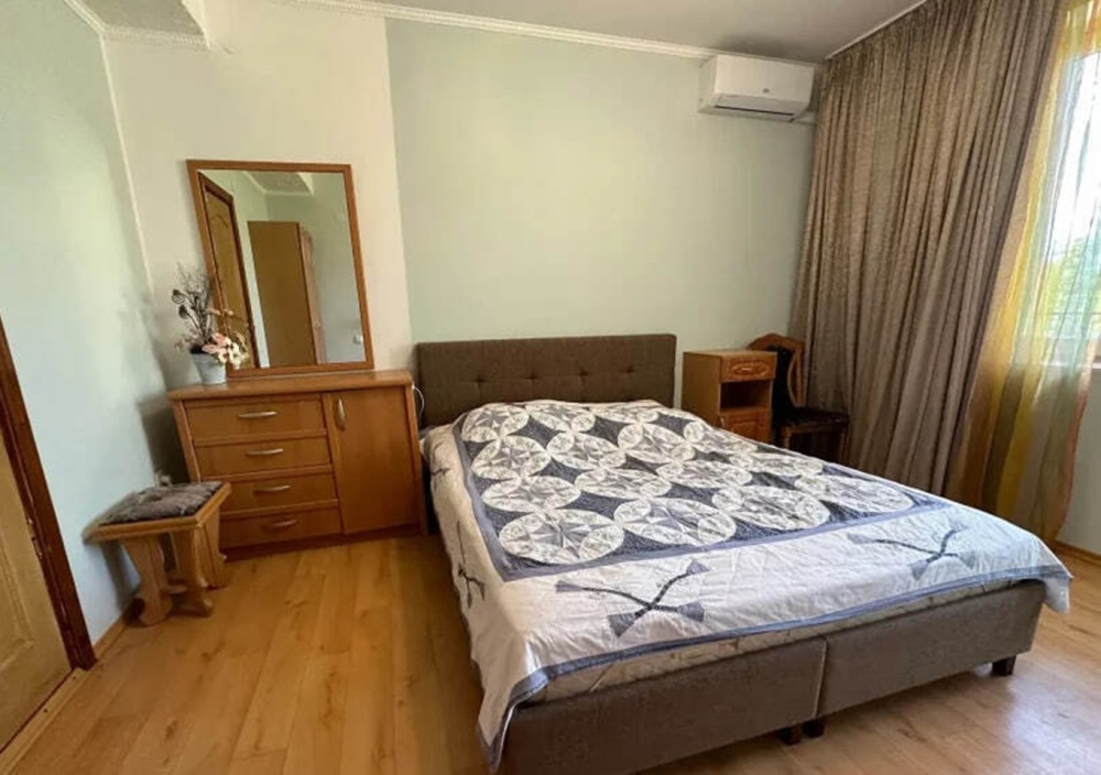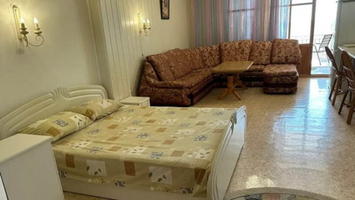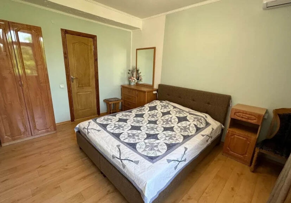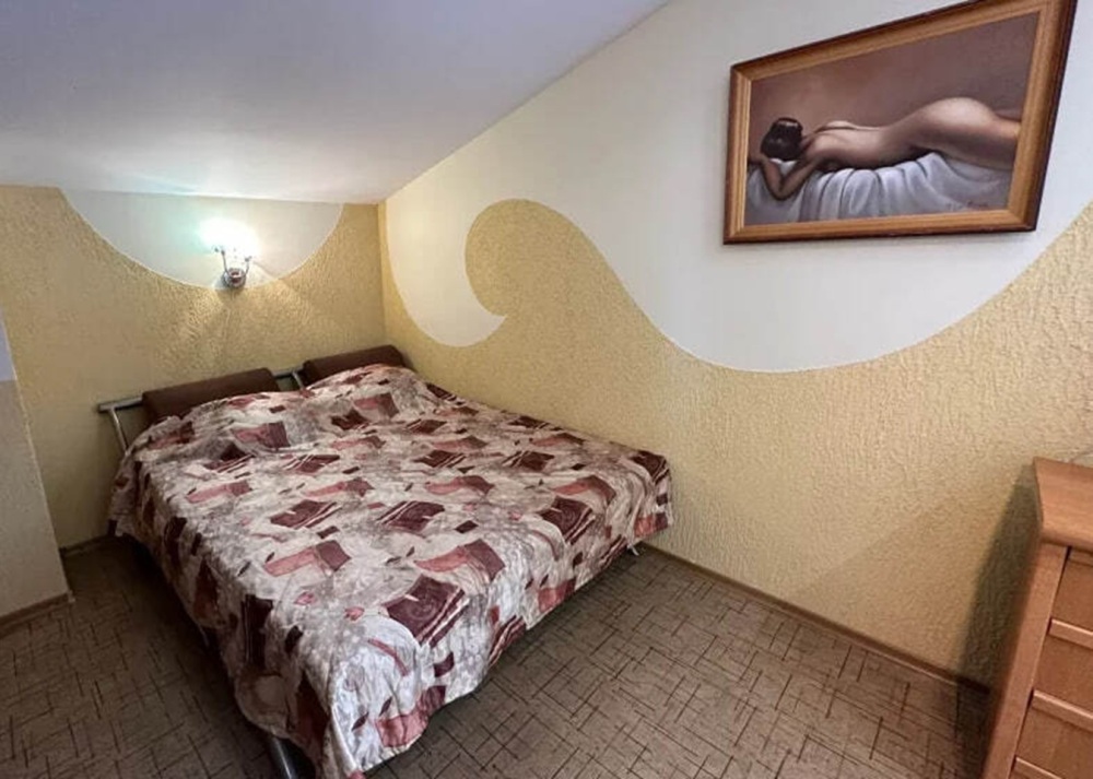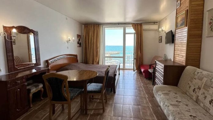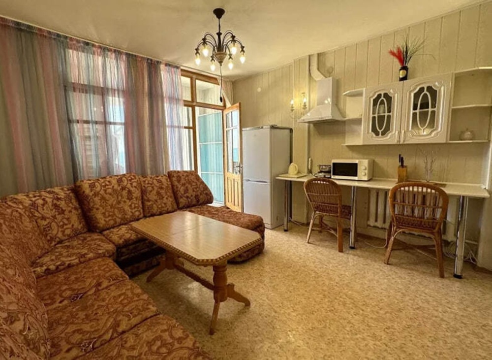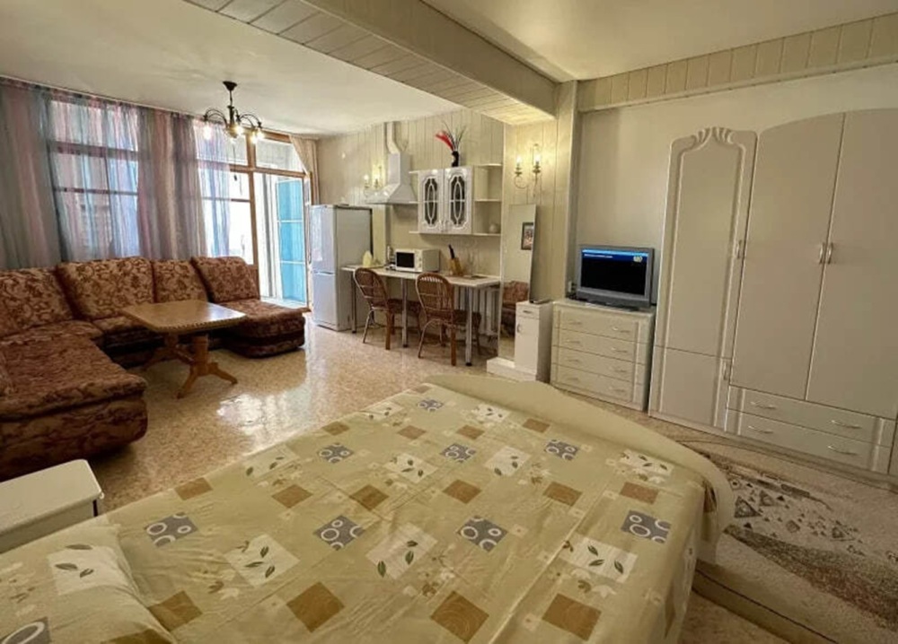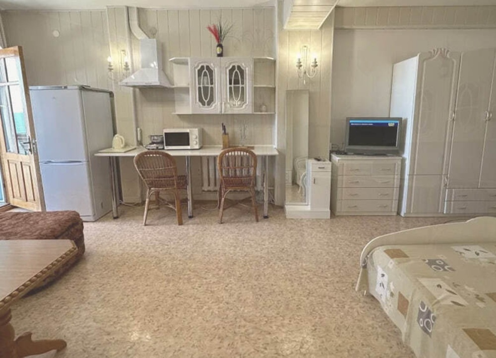 Номер расположен на 2-м этаже. Номер с большим балконом и видом на море. Отдельный вход со стороны моря (винтовая лестница). В номере кровать (спальное место 160 см), угловой раскладной диван. Также в номере есть: кухня, с необходимой посудой эл. плитой и эл. чайником, телевизор, кондиционер, холодильник, санузел (душ,туалет), горячая и холодная воды круглосуточно. Номер предназначен для 2 человек, с возможностью размещения 1 человека на дополнительном месте.