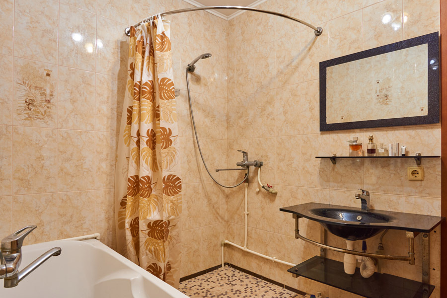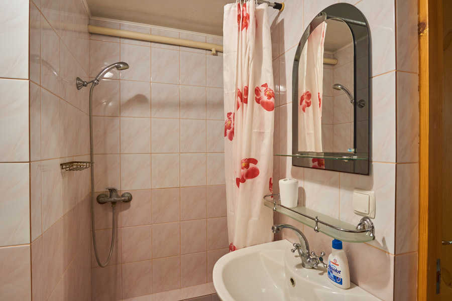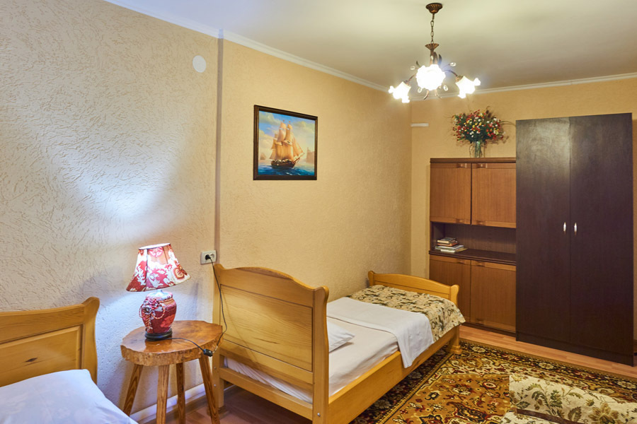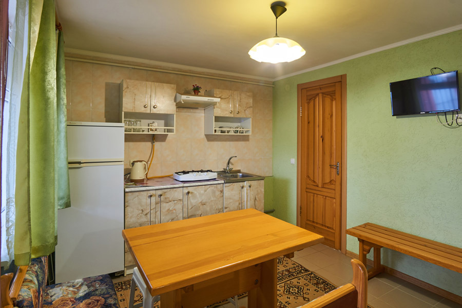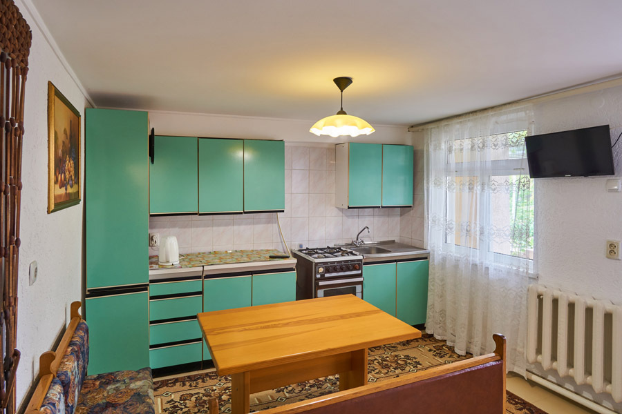 В номере: два телевизора (в комнате и на кухне), кондиционер, Wi-Fi, двуспальная кровать, односпальная кровать, взрослое кресло-кровать, мебель, санузел и душевая раздельно.