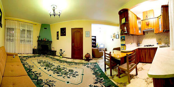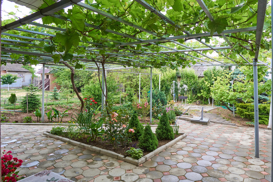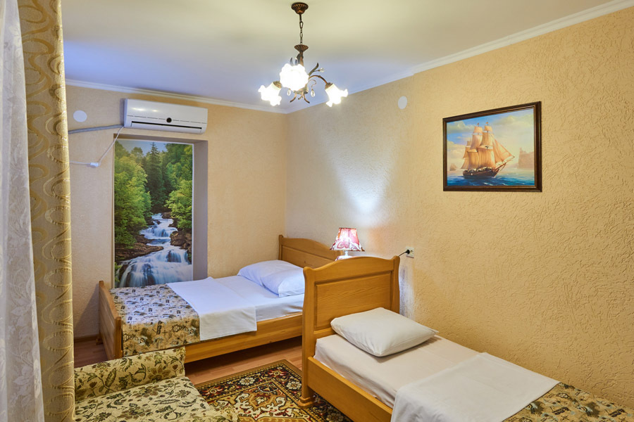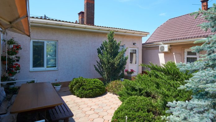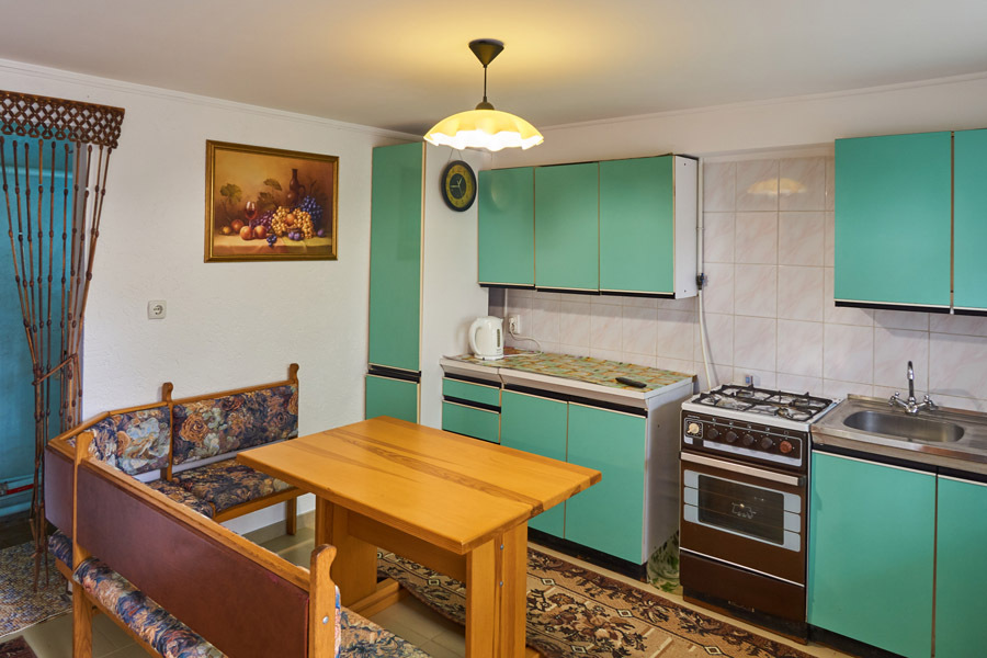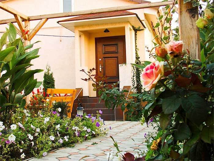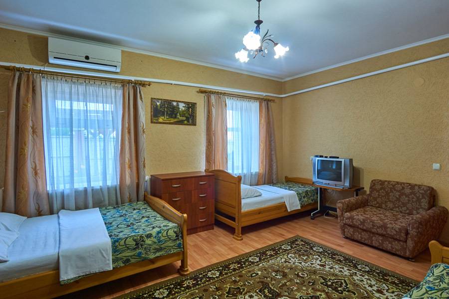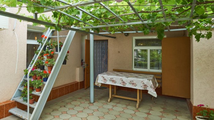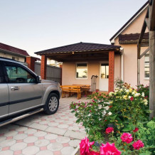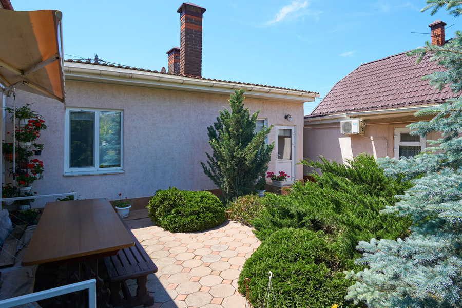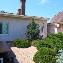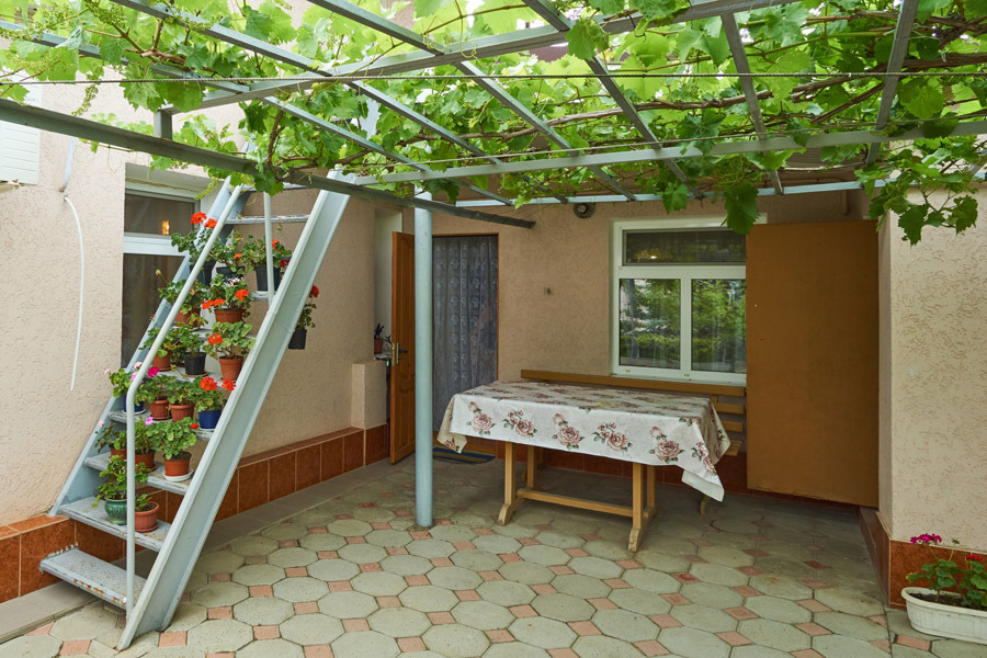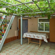 Виноградная беседка защищает от солнца, а осенью гости угощаются сладким, чёрным виноградом. На территории находятся 2 отдельно стоящих друг от друга дома. Для самых взыскательных гостей предлагается 2-х комнатный коттедж-LUX (Апартаменты), в котором с комфортом могут отдохнуть 5 человек. Второй дом разделён на 2 больших номера, каждый из которых имеет отдельный вход и свой уютный дворик. Апартаменты рассчитаны на 4 и 5 человек. В каждых апартаментах есть всё для комфортного отдыха.