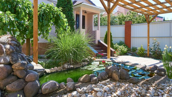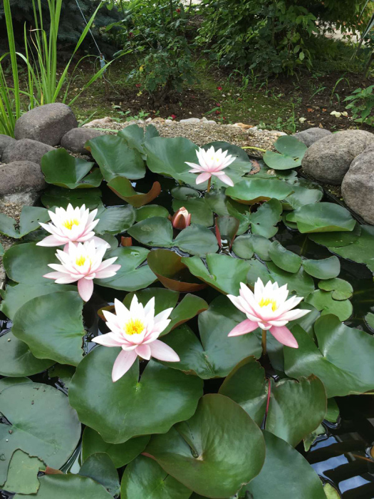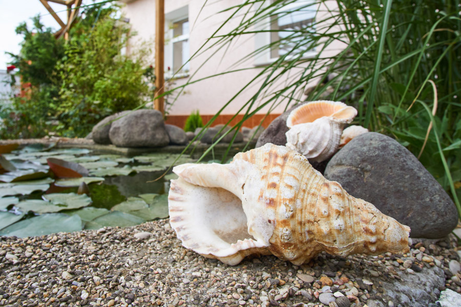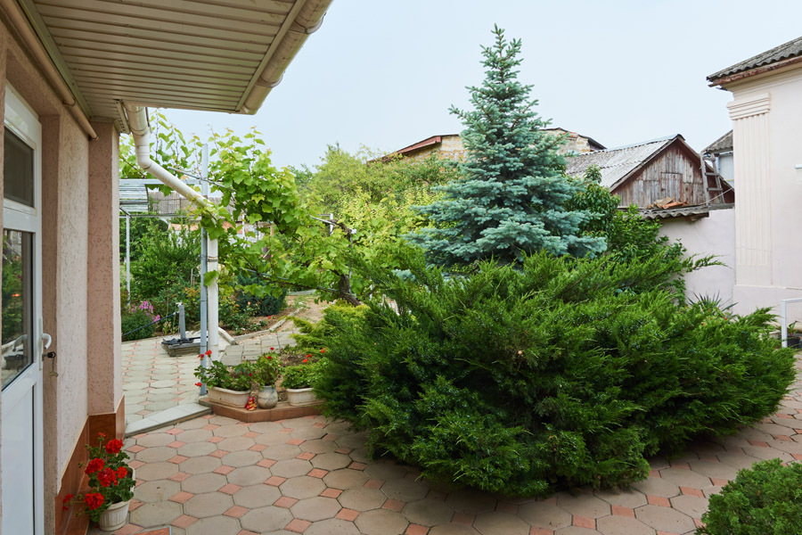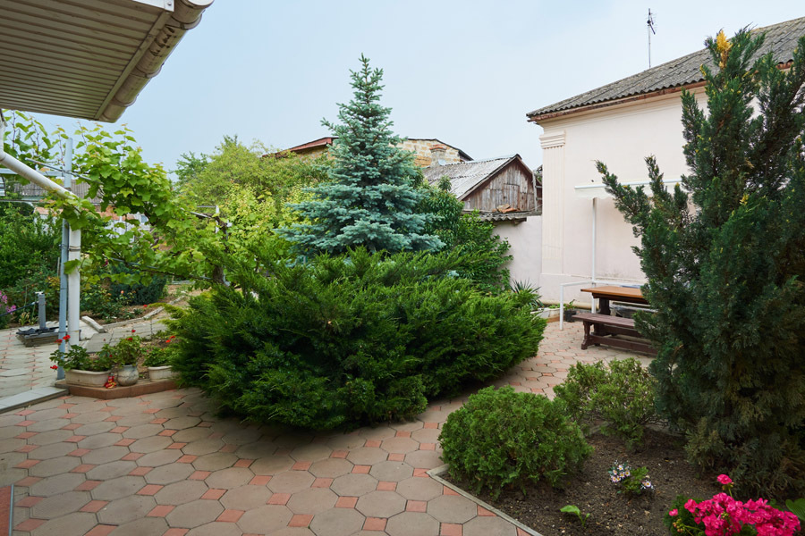 Здесь растут можжевельники, ёлочки, благоухают розы различных оттенков, цветёт герань и величественная гортензия. В пруду цветут нежные лилии, а под их листьями притаились золотые рыбки. В саду зреют сливы, инжир, персики....