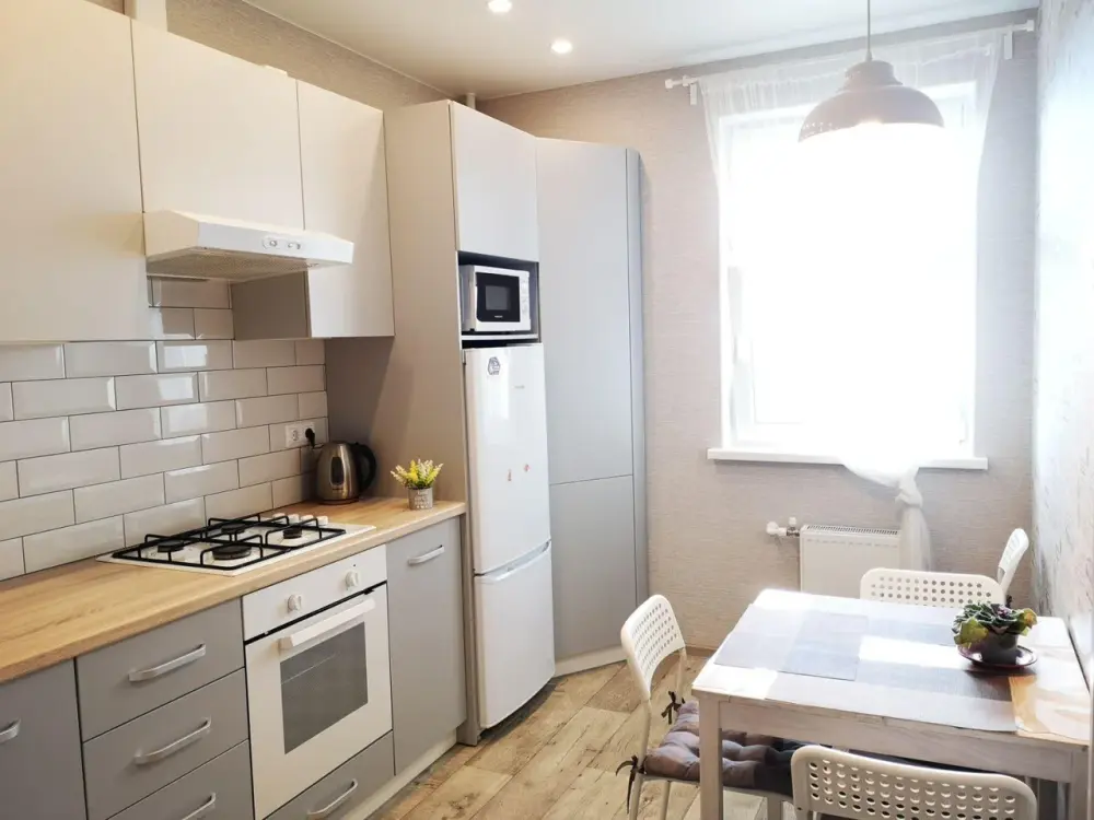 Комната зонирована. Зона спальни вмещает в себя комфортабельную двуспальную кровать, зона гостиной - раскладной диванчик. Это делает комфортным размещение по типу 2+1 и даже 2+2 (оговаривается индивидуально). АГВ, SМАRТ- телевидение и абсолютно все для комфортного проживания!
