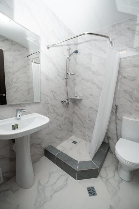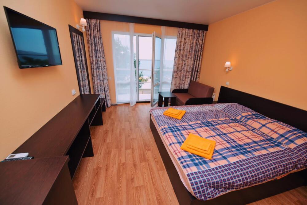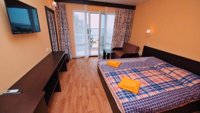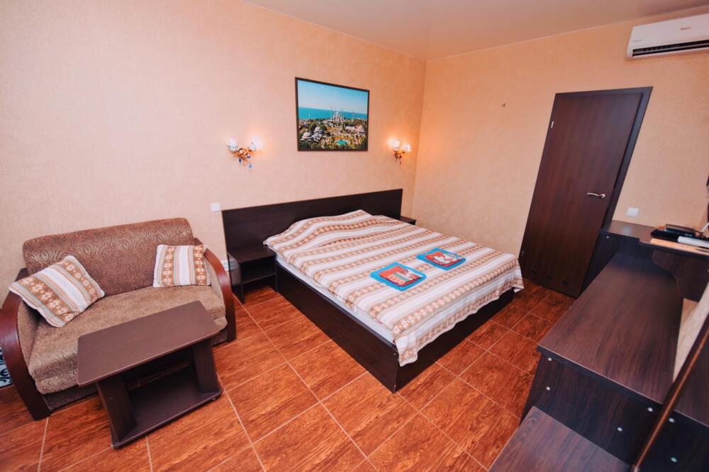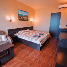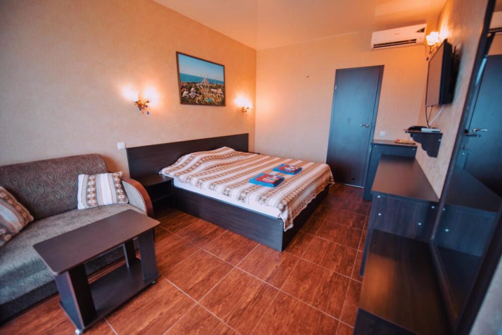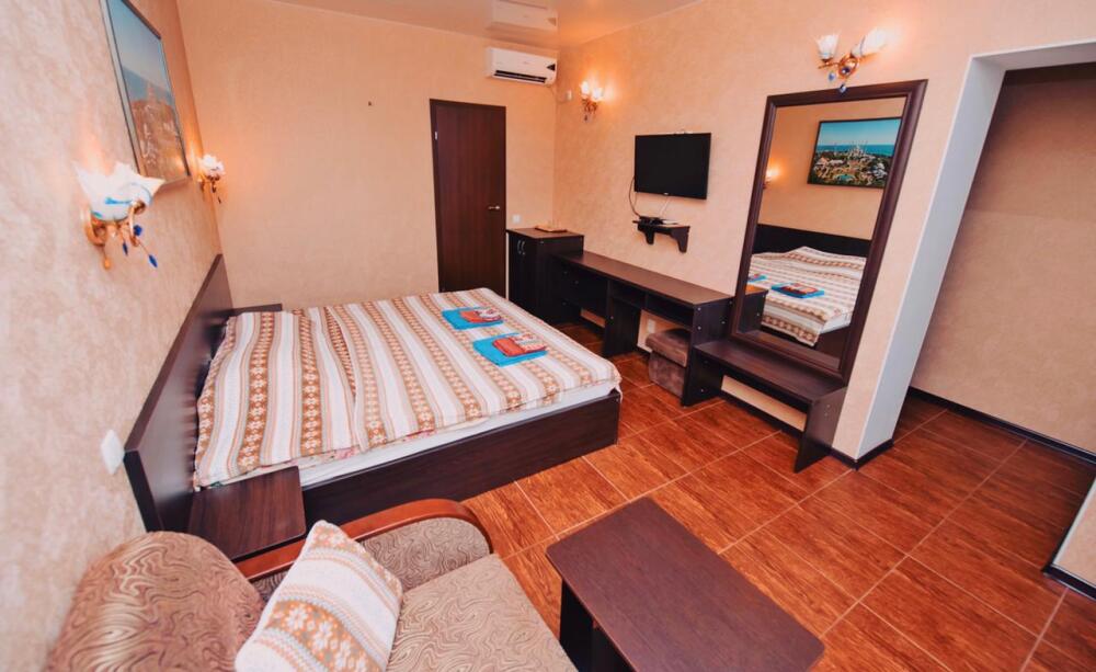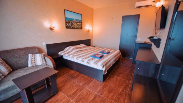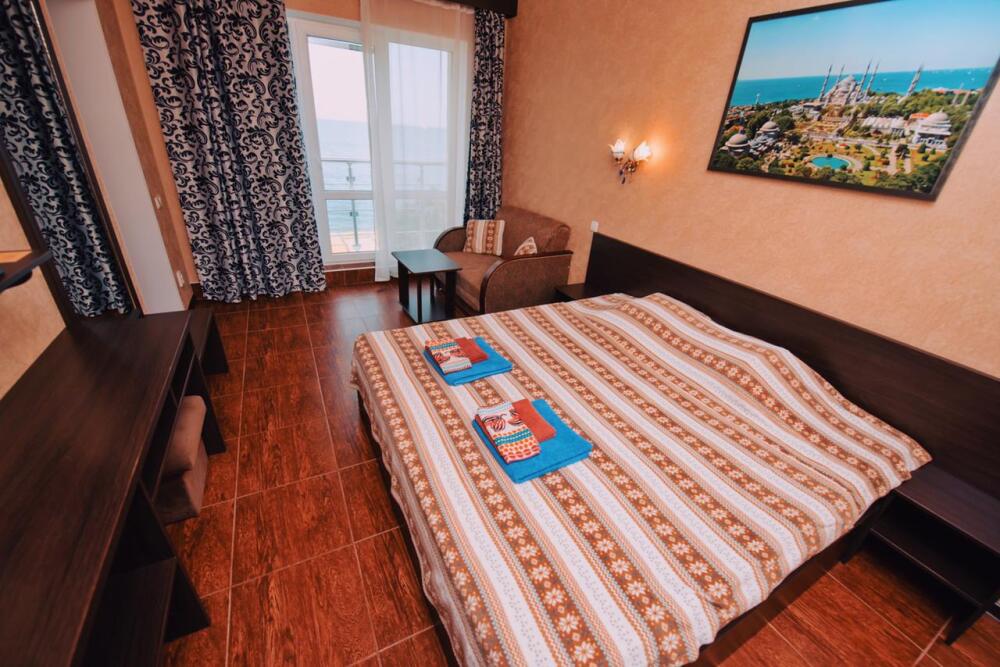 Отель построен в современном стиле и европейском дизайне. Мебель изготовлена по личному заказу из высококачественных материалов. В отеле все номера с прекрасным видом на море и весь залив с панорамными окнами. В каждом номере: 2х спальная кровать,диван,душ,туалет,тв,кондиционер,холодильник,фен,полотенца интернет. Также есть собственный уютный двор,беседка,мангал,кулер с горячей и холодной водой,микроволновая печь,стоянка для авто. Уборка номеров каждые три дня. Чистота и уют поддерживаются регулярно.
