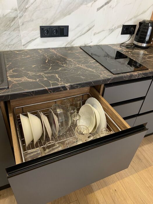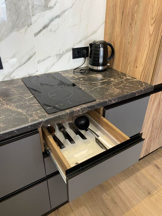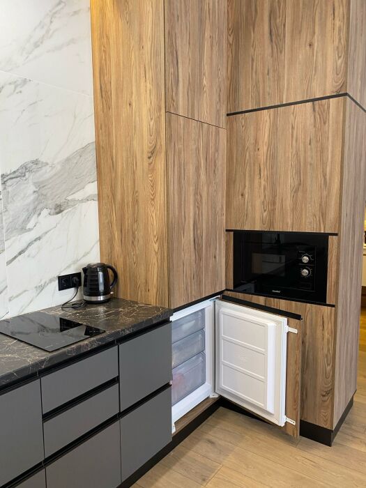 - Кухня оснащена всей необходимой посудой, встроенный большой холодильник с морозильной камерой, микроволновая печь, индукционная плита, электрический чайник, отдельный кран с фильтрованной питьевой водой