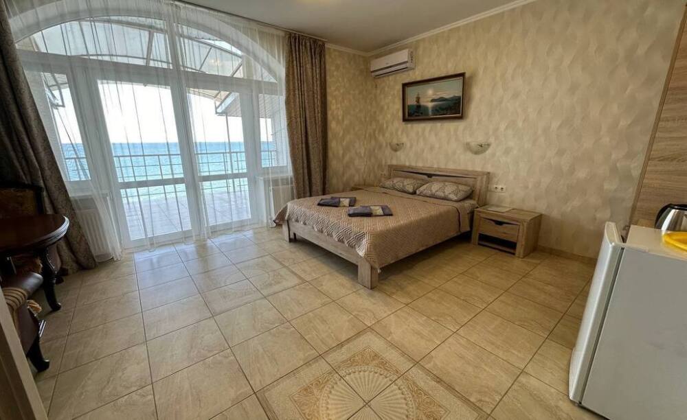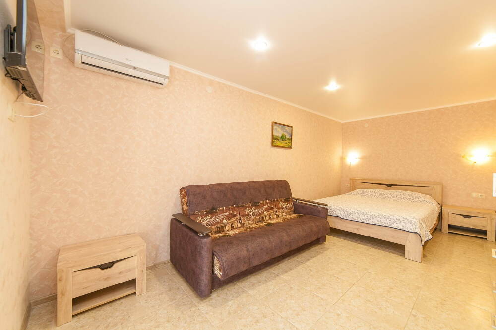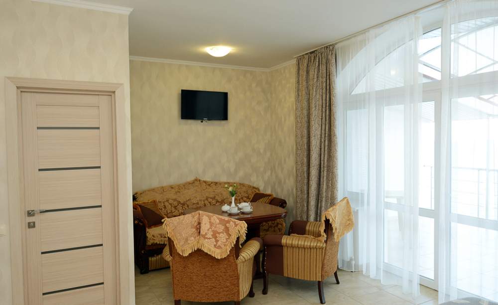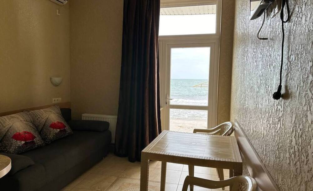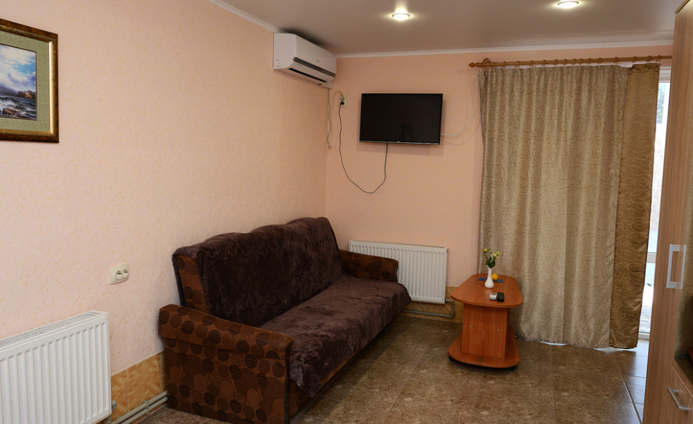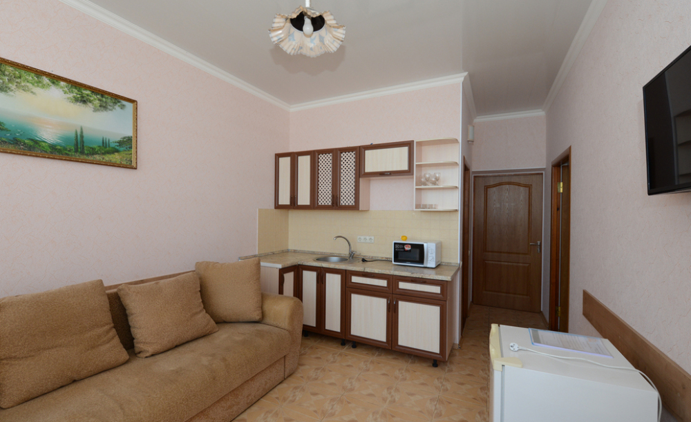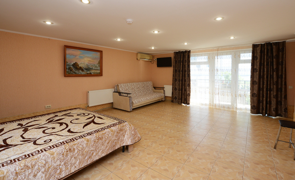 Спальные места: двуспальная кровать, двуспальный диван. В этой комнате есть все для удобного отдыха: своя кухня, посуда, микроволновая печь, индукционная плита на 2 конфорки, холодильник, электрочайник, кондиционер, плазменный телевизор, санузел с душем, фен, шкаф. Большая терраса добавляет дополнительный комфорт этой комнате. Комната этой категории находится на 1 этаже с выходом на море и на мансардном этаже.