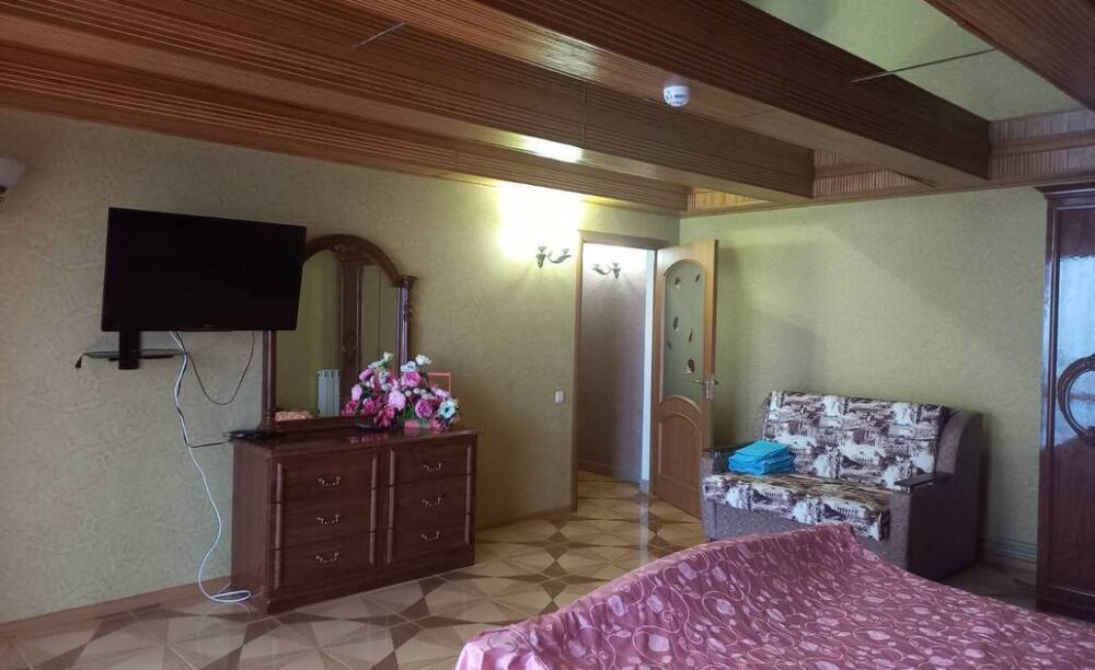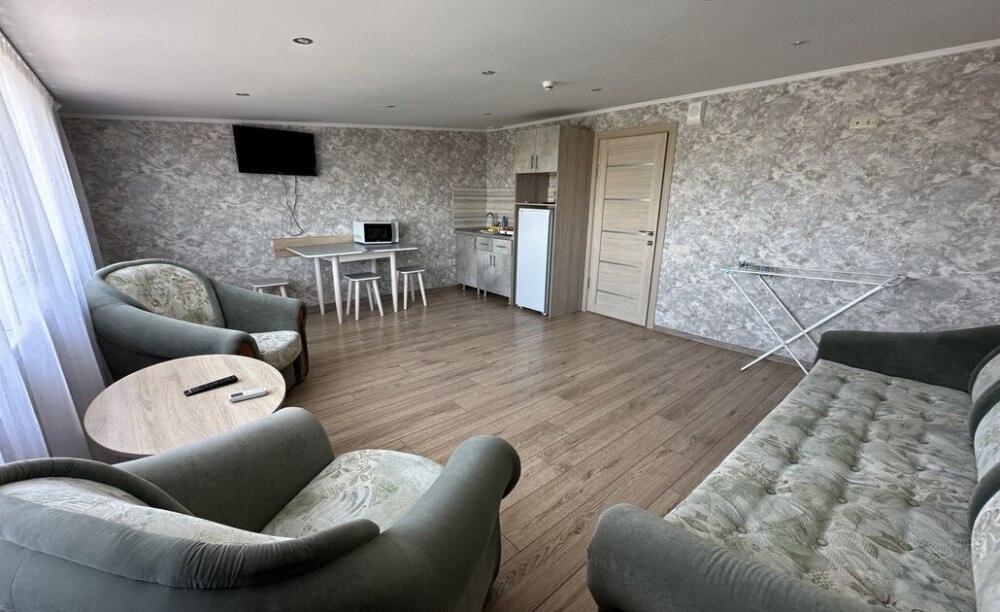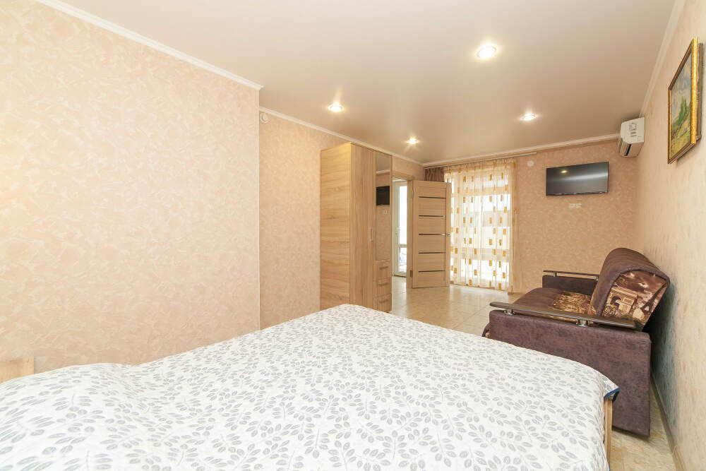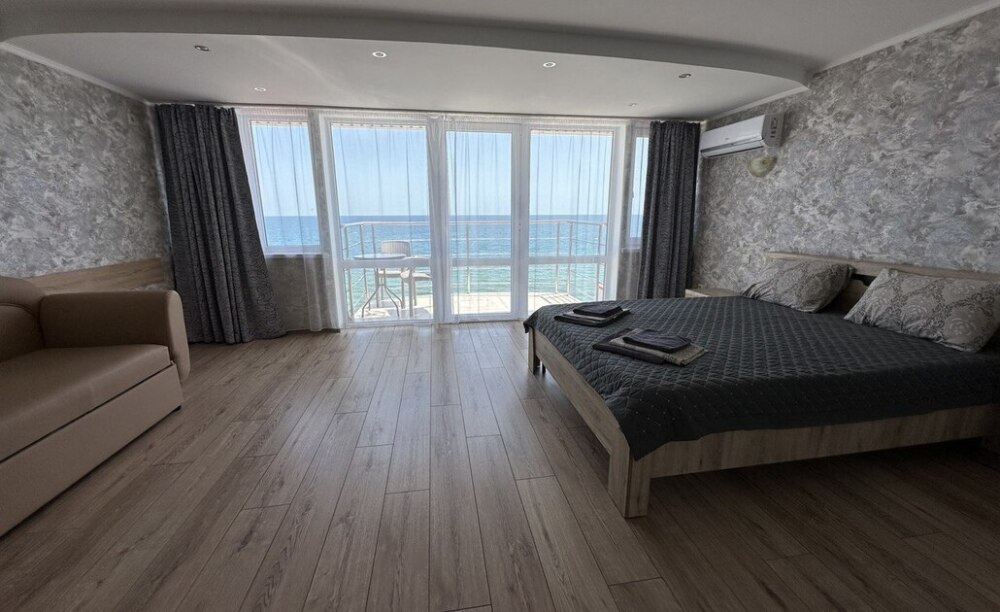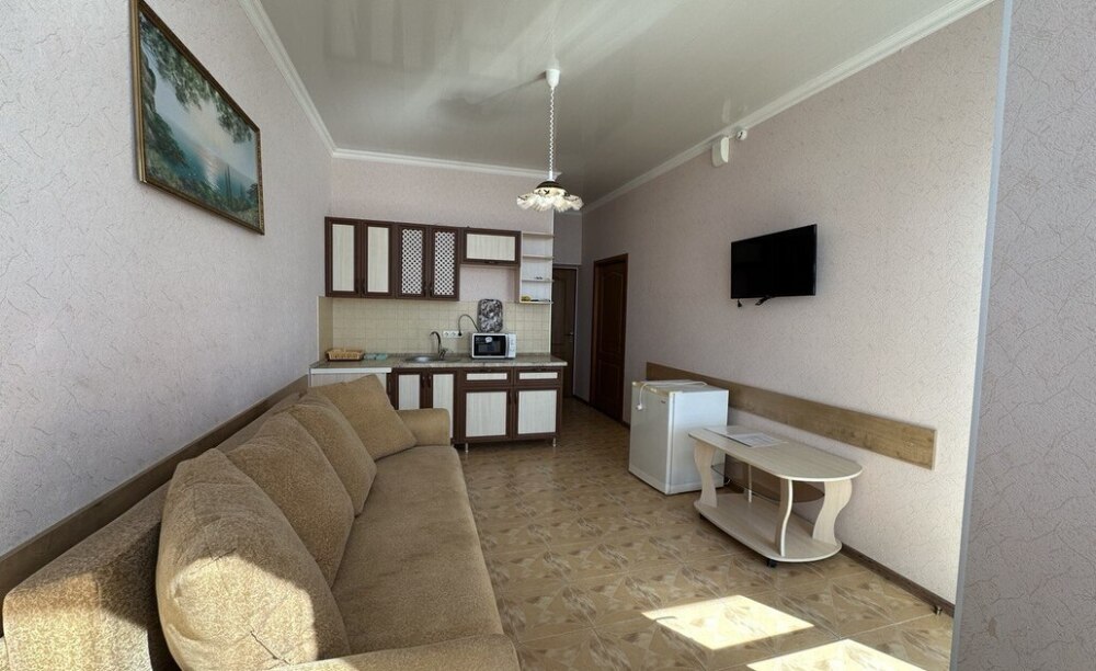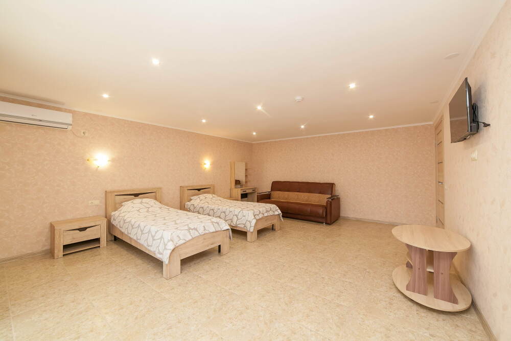 Спальные места: двуспальная кровать, двуспальный диван. В этой комнате есть все для удобного отдыха: своя кухня, посуда, микроволновая печь, индукционная плита на 2 конфорки, холодильник, электрочайник, кондиционер, плазменный телевизор, санузел с душем, фен, шкаф. Большая терраса добавляет дополнительный комфорт этой комнате. Комната этой категории находится на 1 этаже с выходом на море и на мансардном этаже.