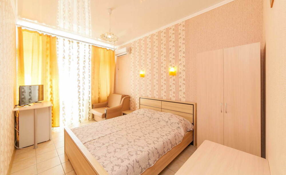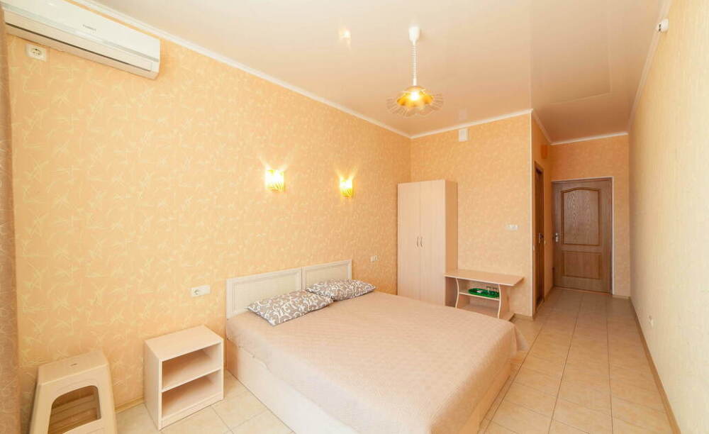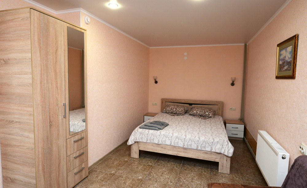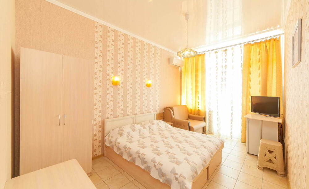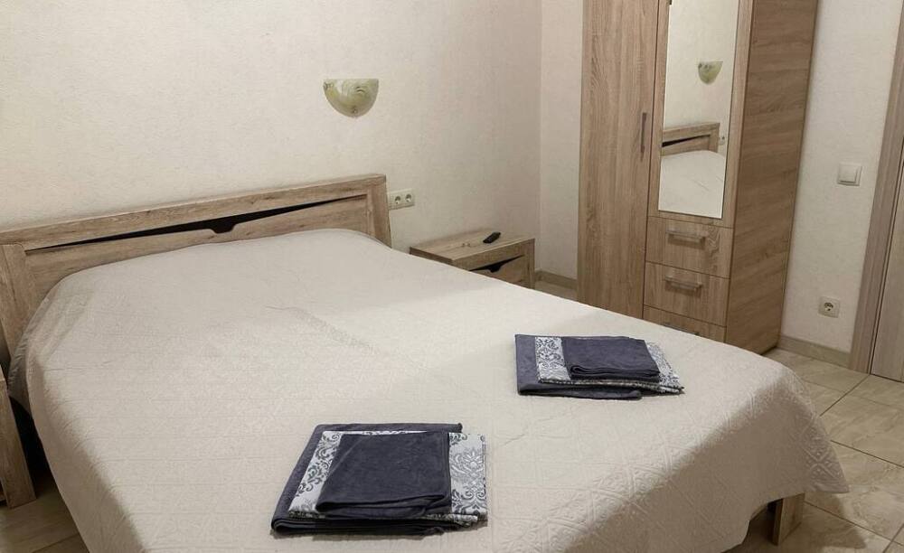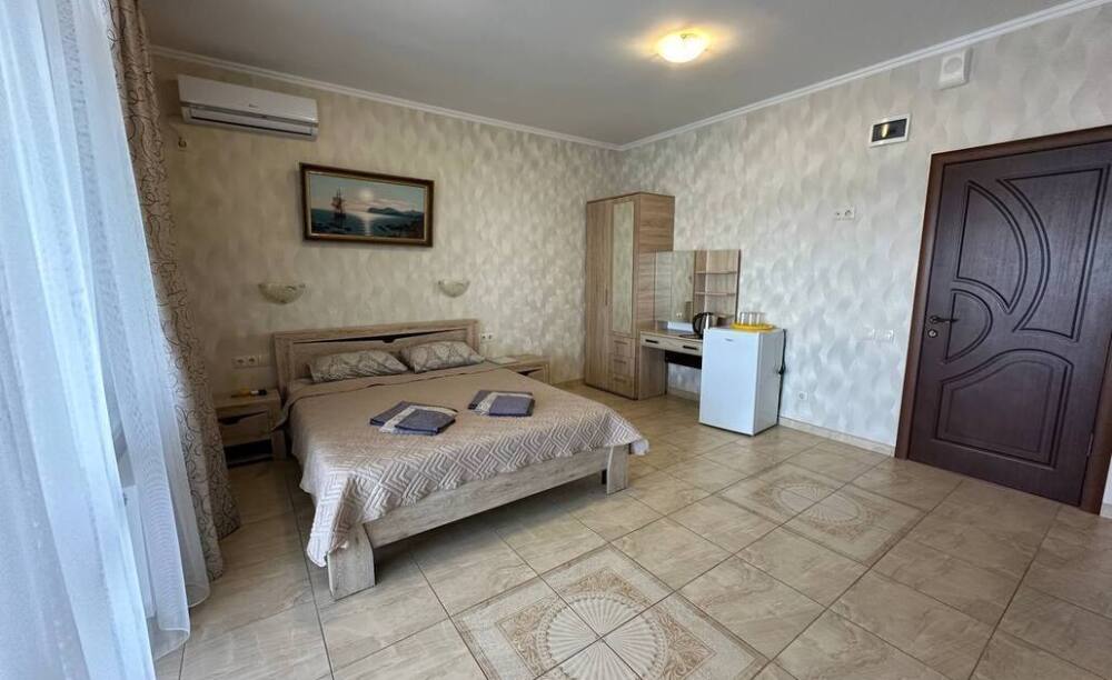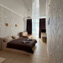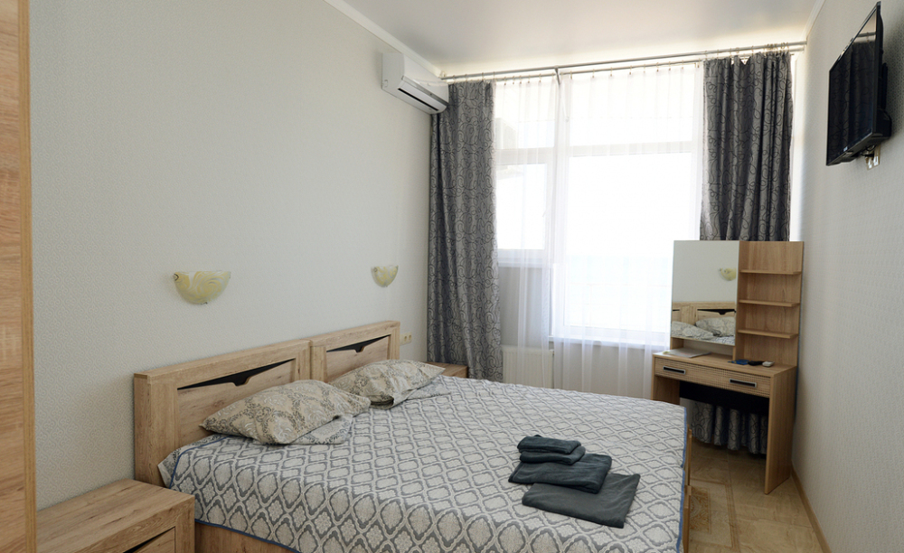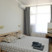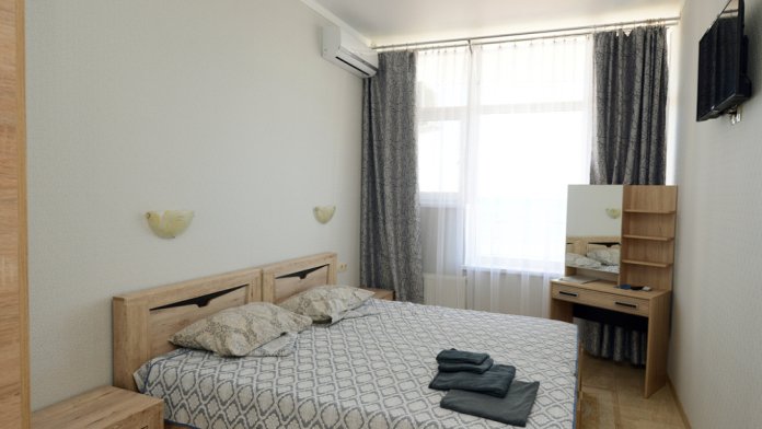 Спальное место в комнате: одна двуспальная кровать (ширина 170 см). В этой комнате есть все для удобного отдыха: кондиционер, плазменный телевизор, холодильник, санузел с душем, фен, шкаф. Прекрасный вид на море с балкона добавляет комфорт этой комнате. Комнаты находятся на 4-5 этажах.