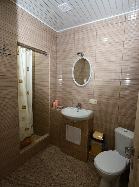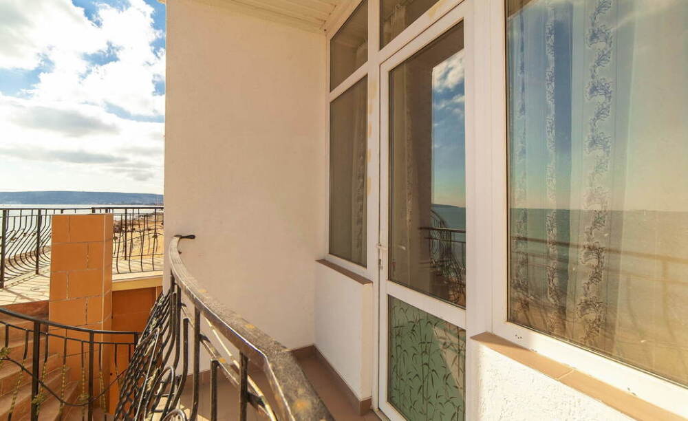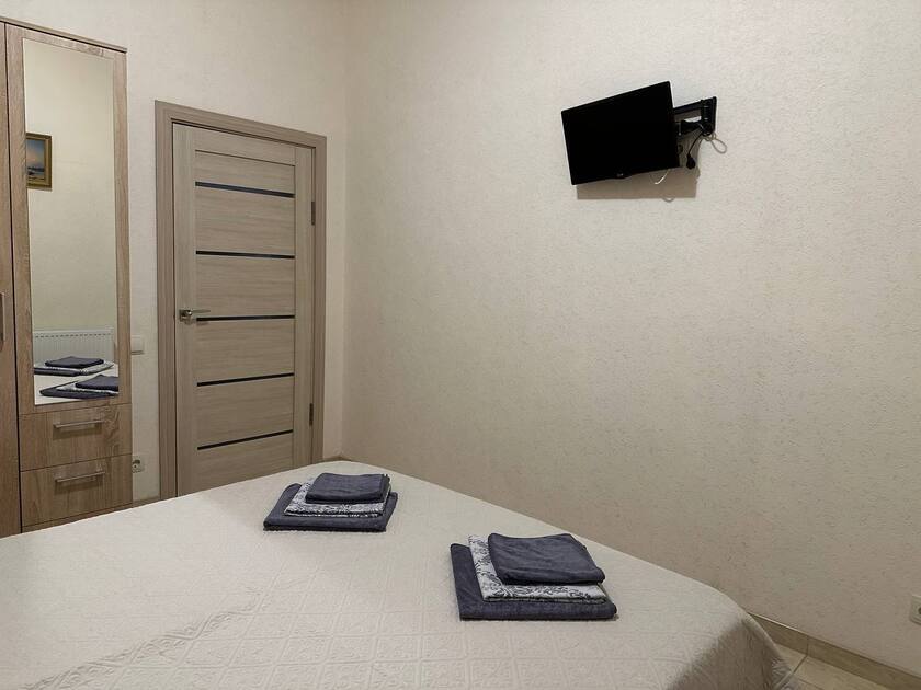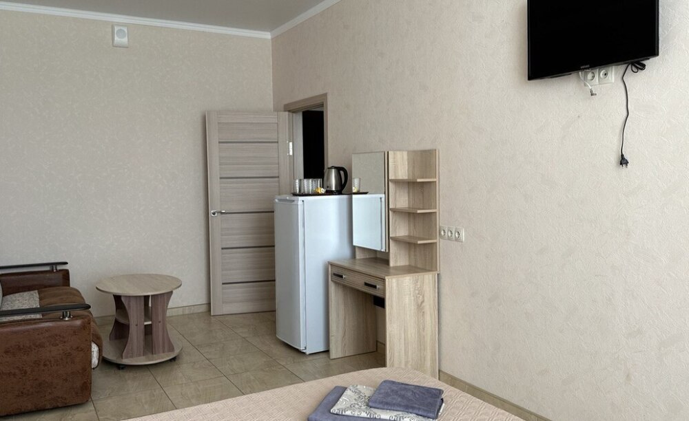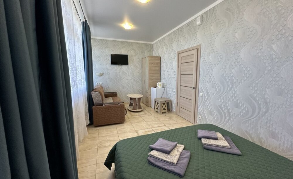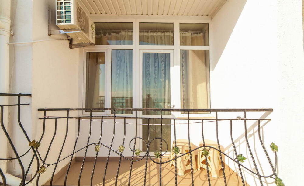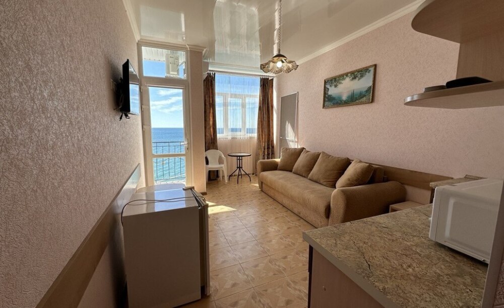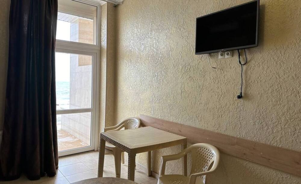 Спальные места в комнате: двуспальная кровать, двуспальный диван. В этой комнате есть все для удобного отдыха: своя кухня, посуда, микроволновая печь, индукционная плита на 2 конфорки, холодильник, электрочайник, кондиционер, плазменный телевизор, санузел с душем, фен, шкаф. Балкон с видом на море добавляет дополнительный комфорт этой комнате. Комната этой категории находится на мансардном этаже.
